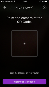 The smartphone app wizard first sets you up with a NETGEAR account, or you can log into an existing one. It will then prompt you that your router isn't set up, and will guide you through the process, starting with scanning the QR code on the bottom of the device. This is very small and took us a little while to get the distance right so it would be scanned correctly.