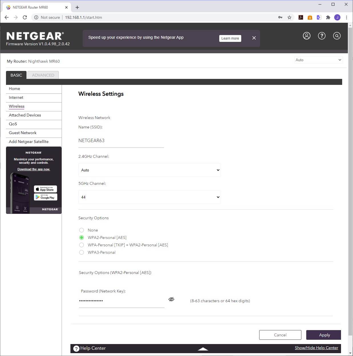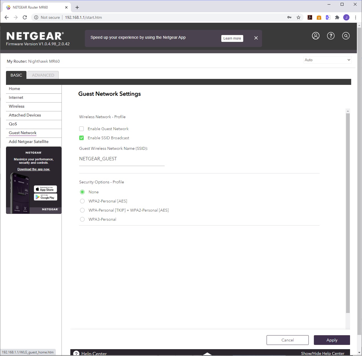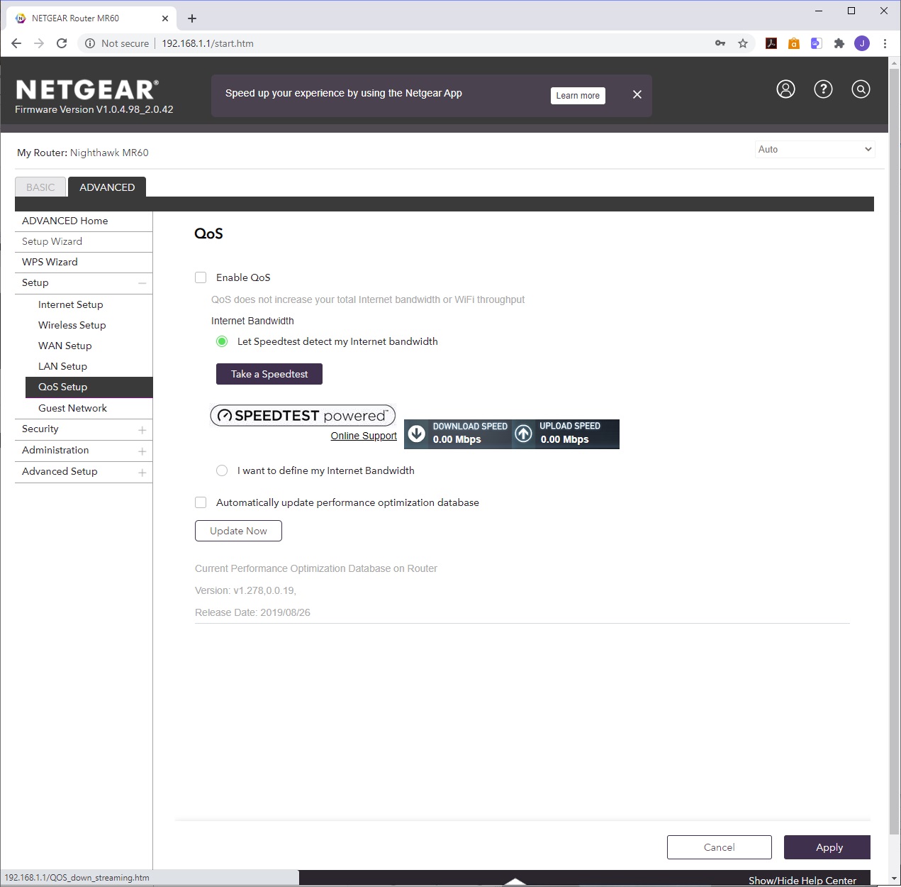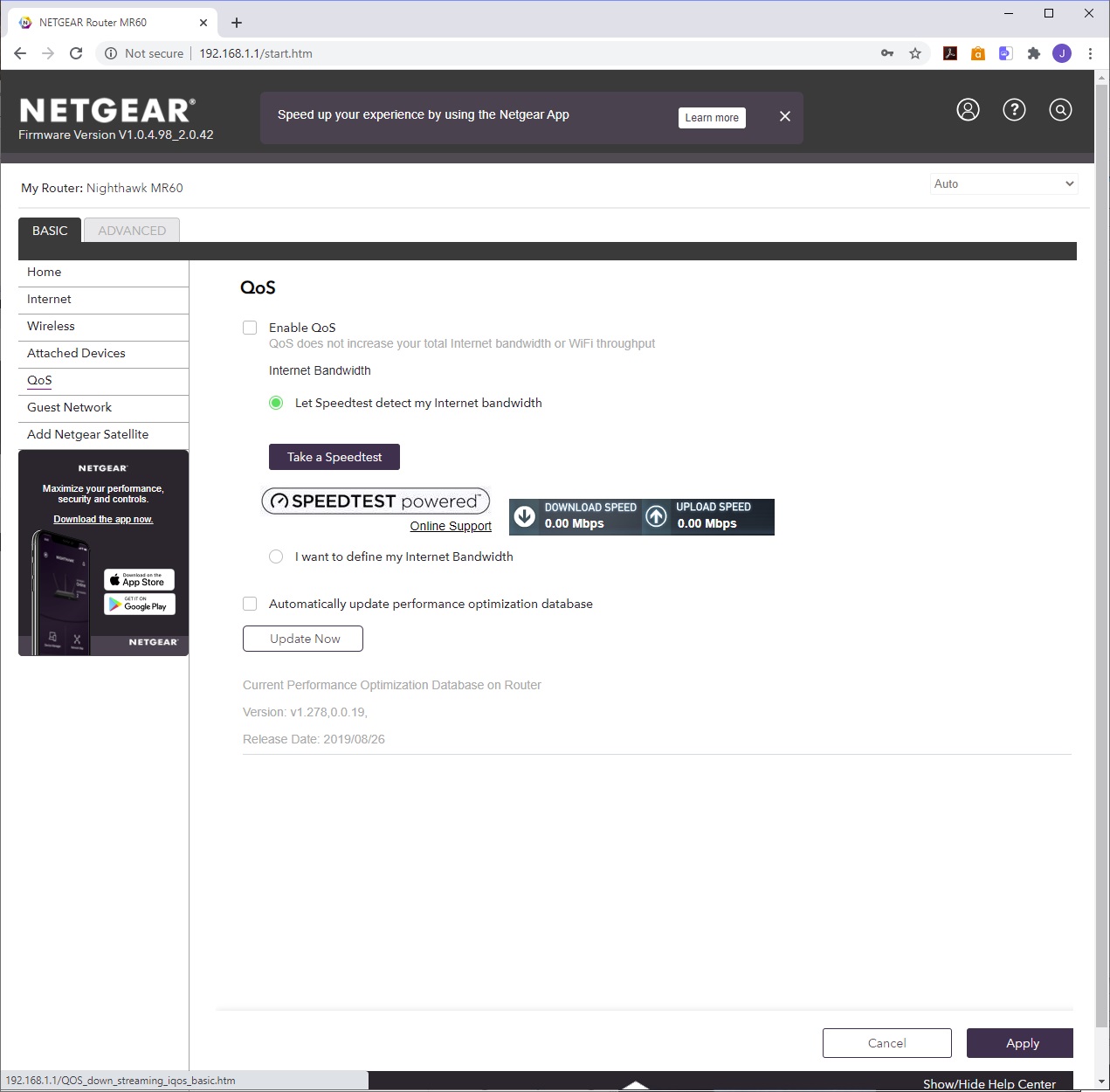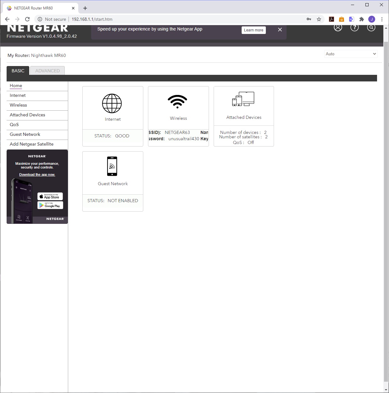 There's a lot more available if you log into the standard Web interface, however. The opening Home screen in the Basic section provides an overall view of WiFi status. Under Internet, you can reconfigure your broadband connection. You can alter the WiFi settings under Wireless, and view devices on the network via Attached Devices. The QoS system, when enabled, isn't as elaborate as, for example, ASUS's or NETGEAR's gaming devices empowered with DumaOS. You can set up a Guest Network for wireless visitors, and trigger the wizard for adding extra mesh satellites.