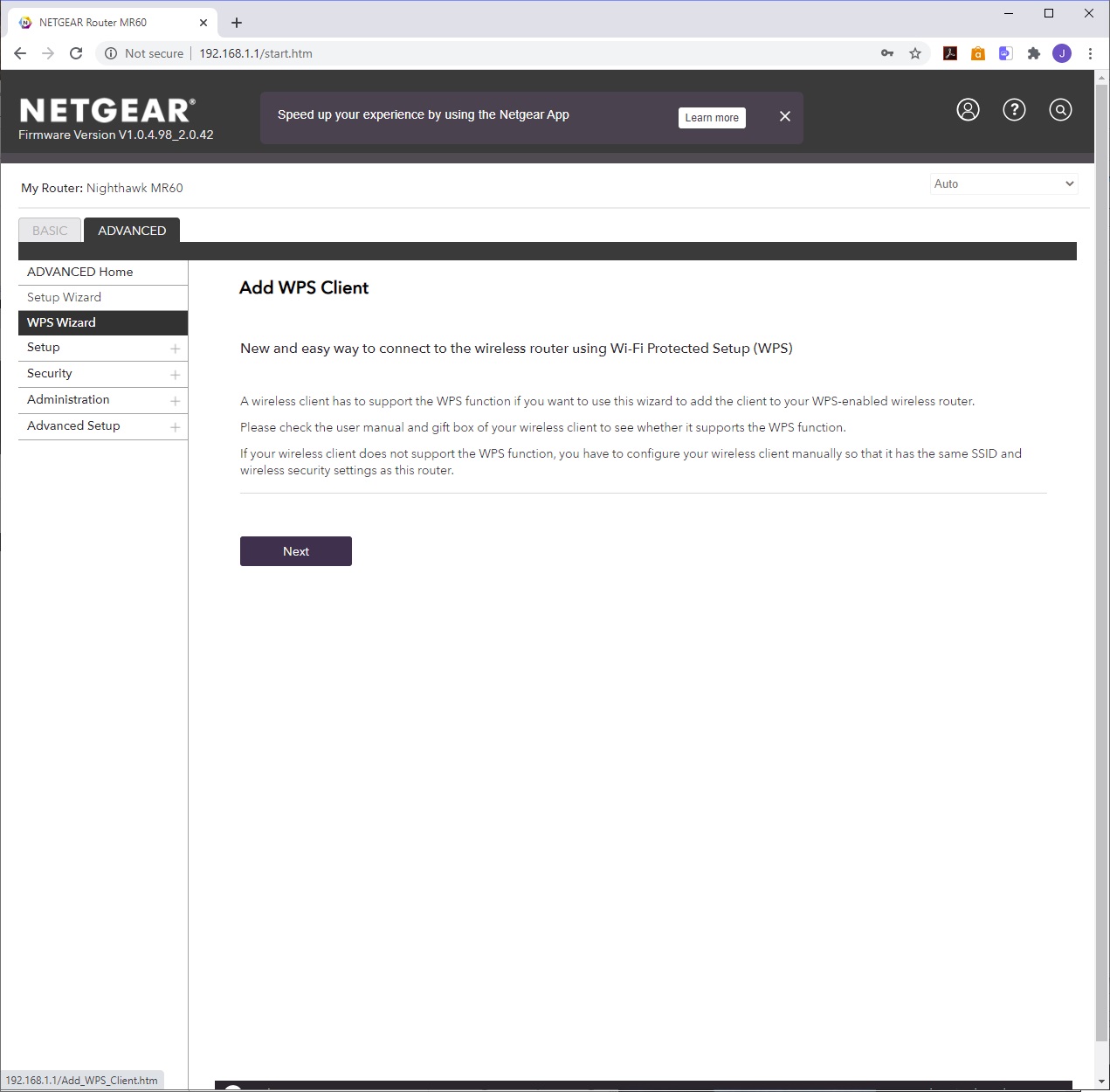 The Advanced section has a Home screen with more information than the basic one. Further down is an option to attach clients via WPS.