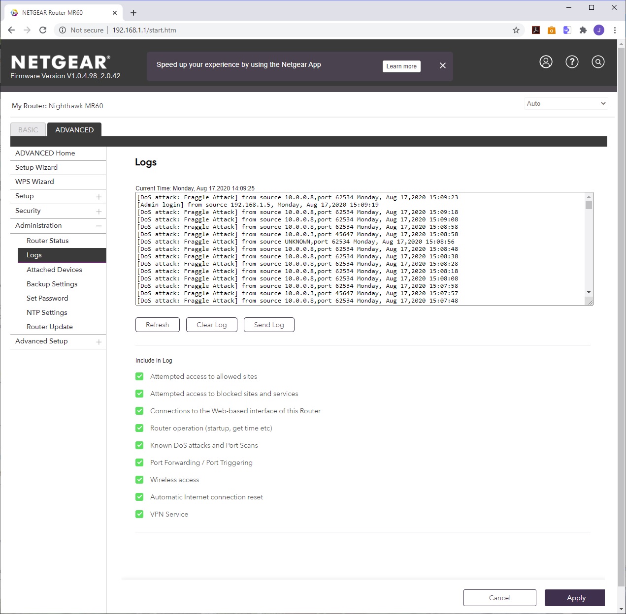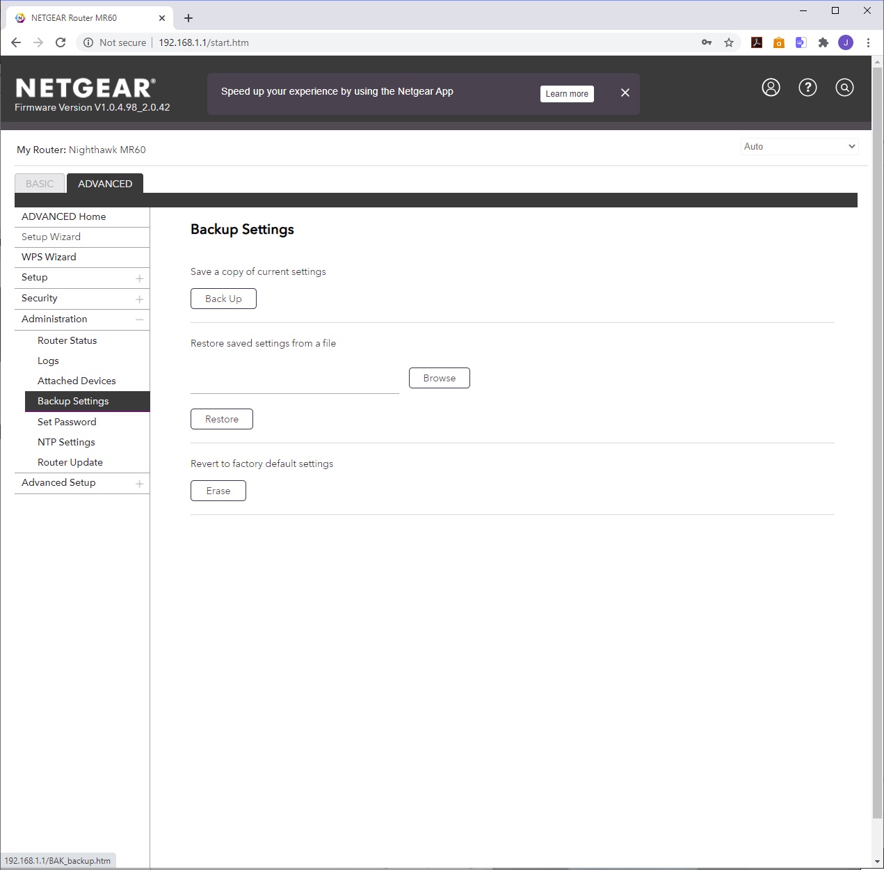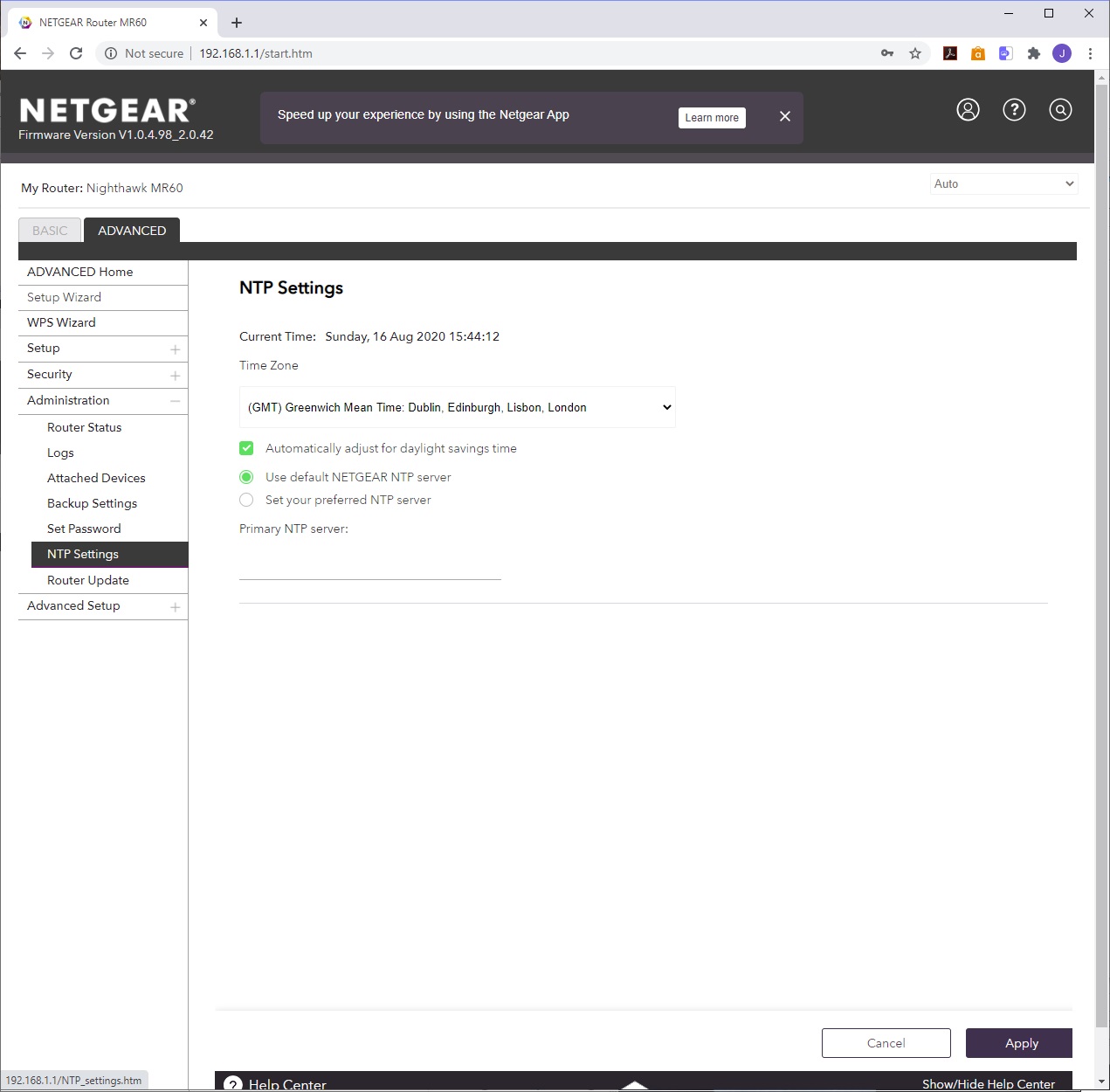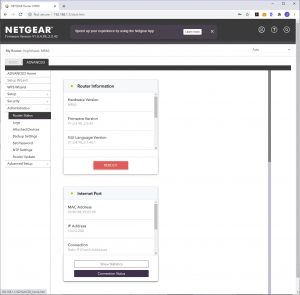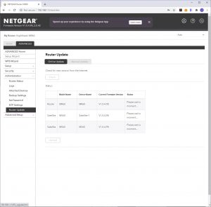 Under Administration, you can view the Router Status, as well as activity logs. You can also see a listing of attached satellite and client devices. You can backup and restore the router settings, and set the admin password. You can also configure the timezone and which NTP server to use to retrieve the time automatically from. You can also use this section to update the firmware on the router and satellites.