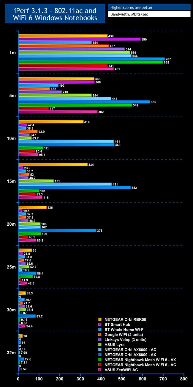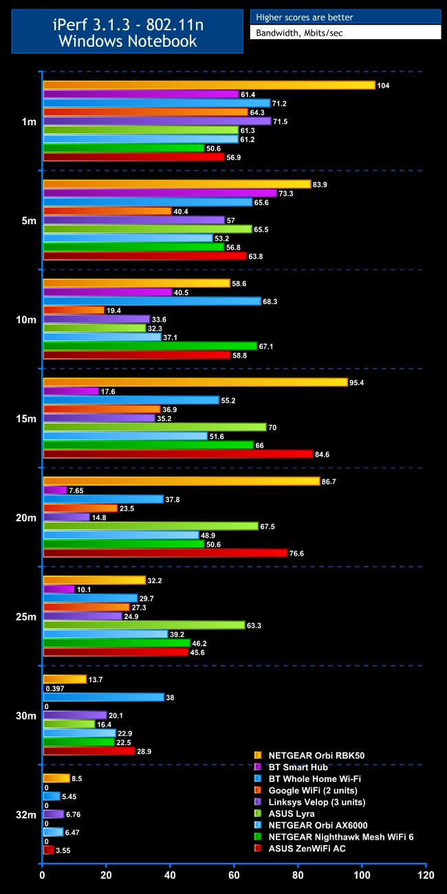 At 5m, the WiFi 6 throughput of 549Mbits/sec is also excellent. However, 802.11ac performance is extremely mediocre at 147Mbits/sec. The WiFi 6 performance also drops at 10m to 120Mbits/sec, although this is still decent compared to 802.11ac-only mesh WiFi systems, including itself as throughput falls by a third to 80.4Mbits/sec with an 802.11ac client. Neither of these results are even close to the Orbi AX6000.