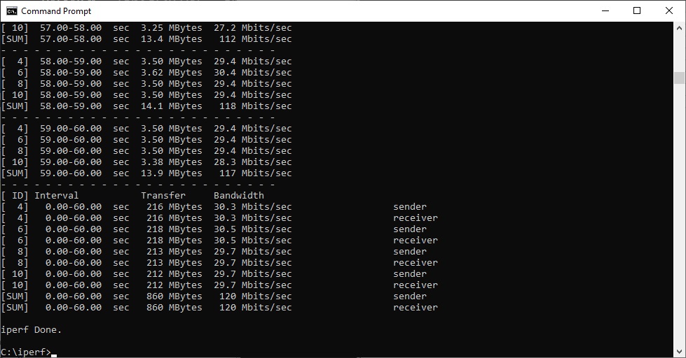 Note that the client command sends four streams of data simultaneously, simulating a multi-client connection as closely as possible with just one client. It takes 60 throughput readings at one second intervals and then averages the result.