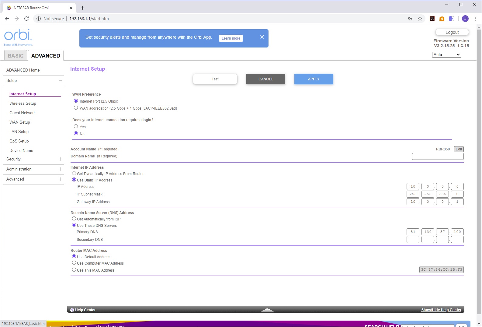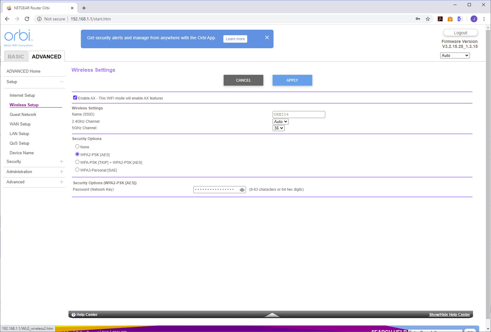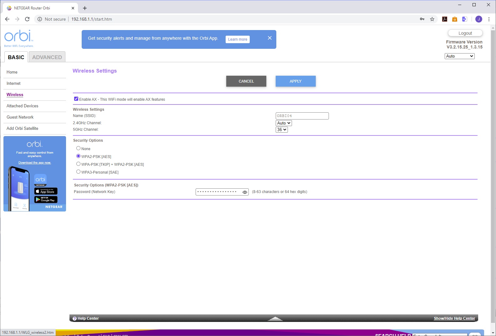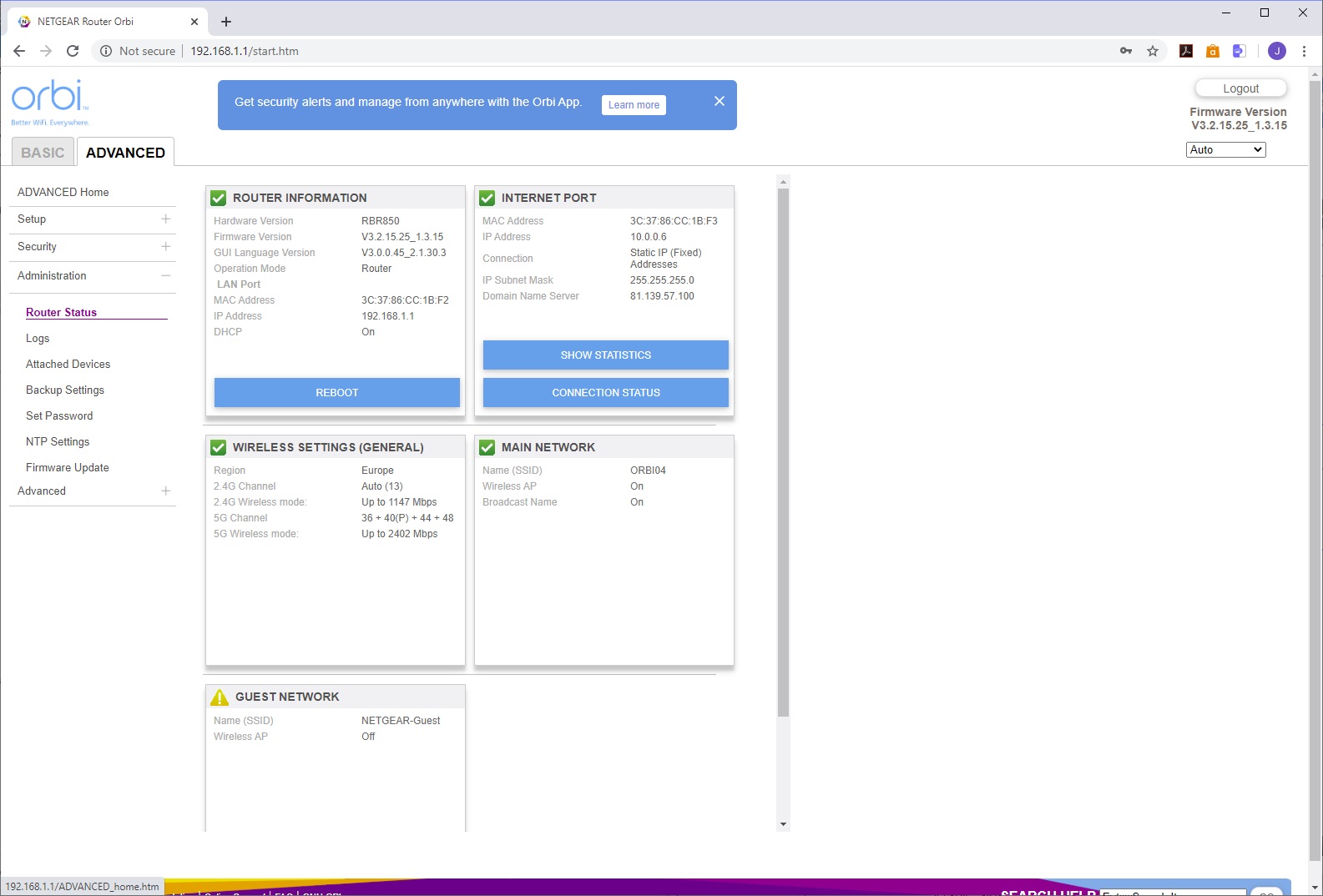 You use the SSID and password printed on the bottom of the router to connect to the AX6000's WiFi, then load the Orbi app to take you through setup, with a QR code to sign you in that's also on the bottom of the router. The setup leads you through configuring your broadband connection, then links the router to its satellite, after which it takes you through customising the WiFi SSID and password, admin login and password, recovery questions, and finally firmware updating, if required. After a reboot, the system is ready.