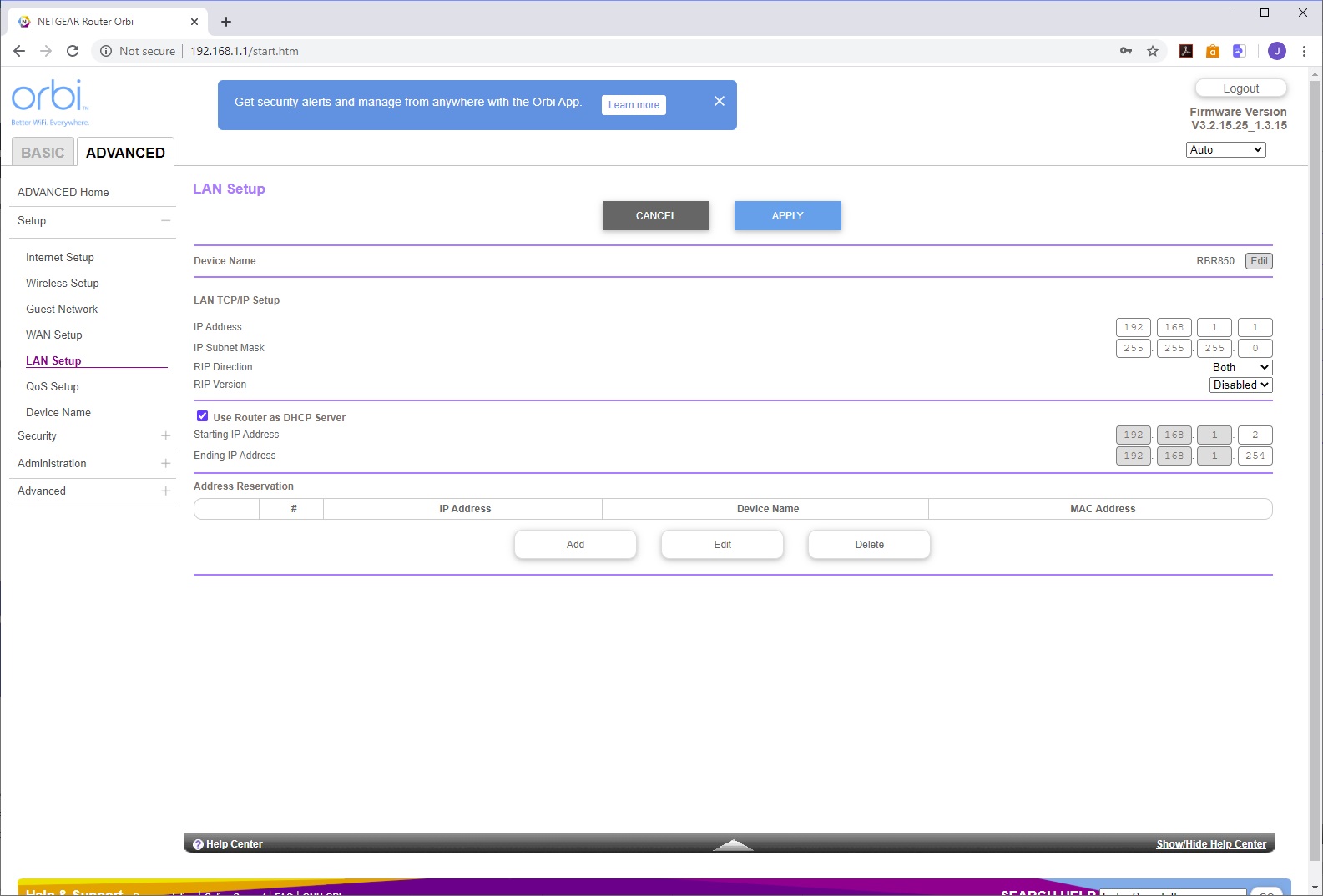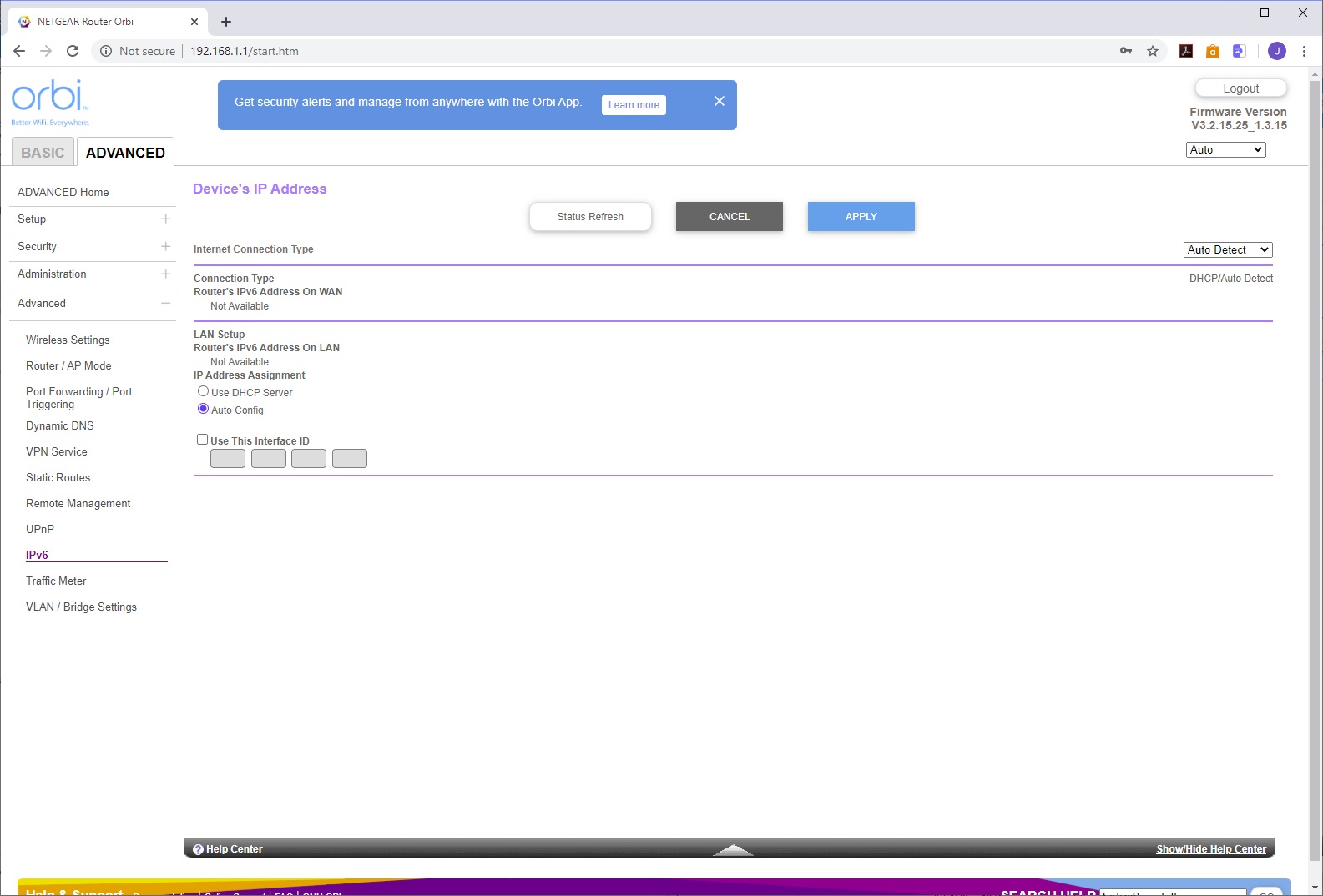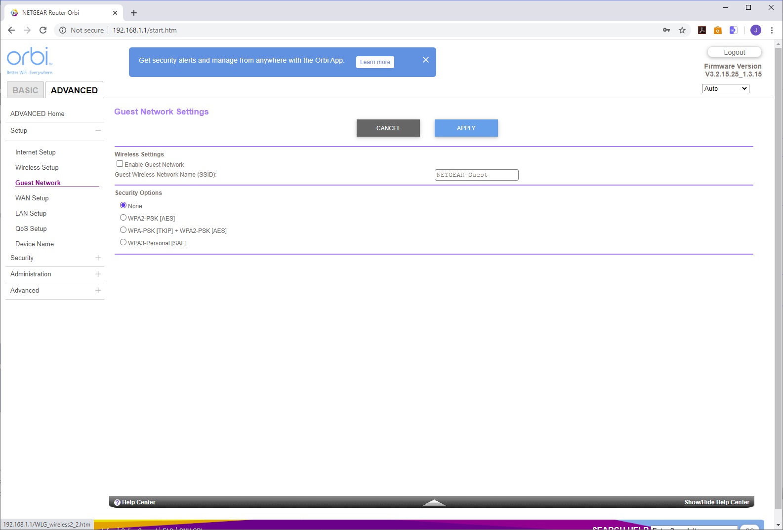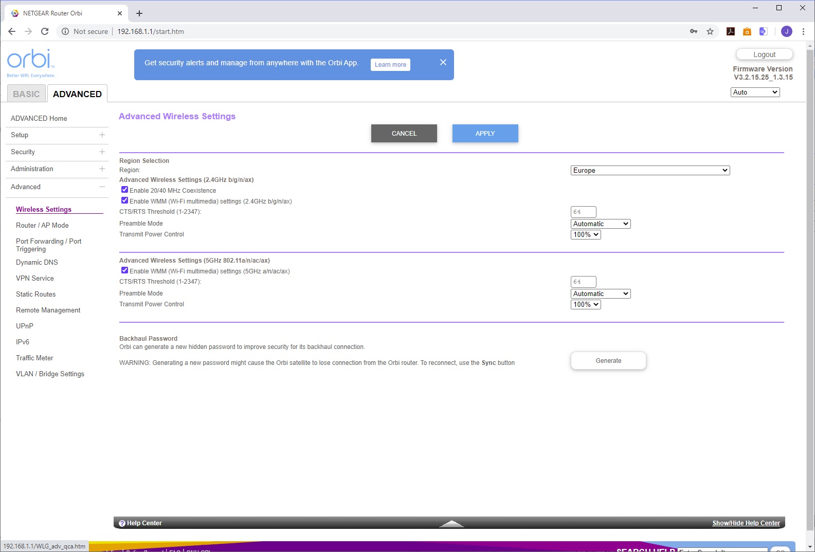 You use the SSID and password printed on the bottom of the router to connect to the AX6000's WiFi, then load the Orbi app to take you through setup, with a QR code to sign you in that's also on the bottom of the router. The setup leads you through configuring your broadband connection, then links the router to its satellite, after which it takes you through customising the WiFi SSID and password, admin login and password, recovery questions, and finally firmware updating, if required. After a reboot, the system is ready.