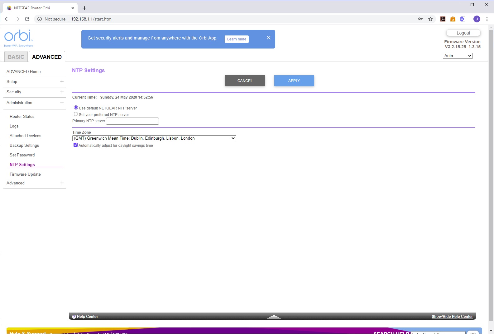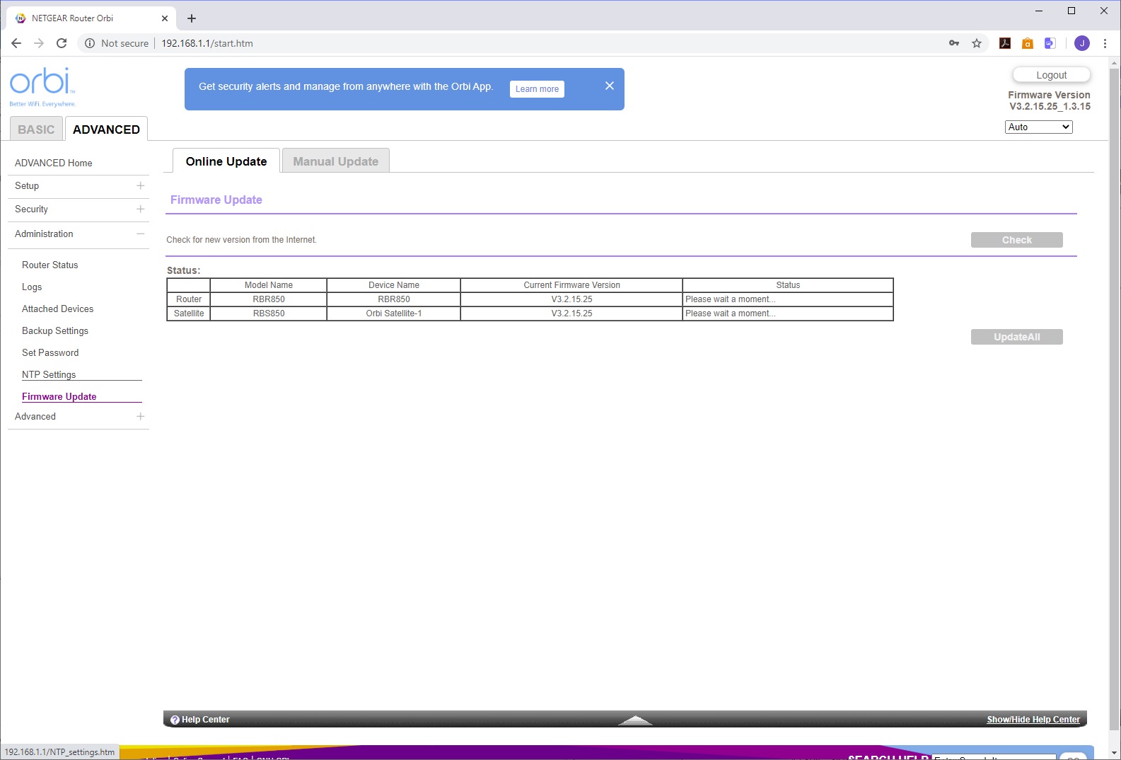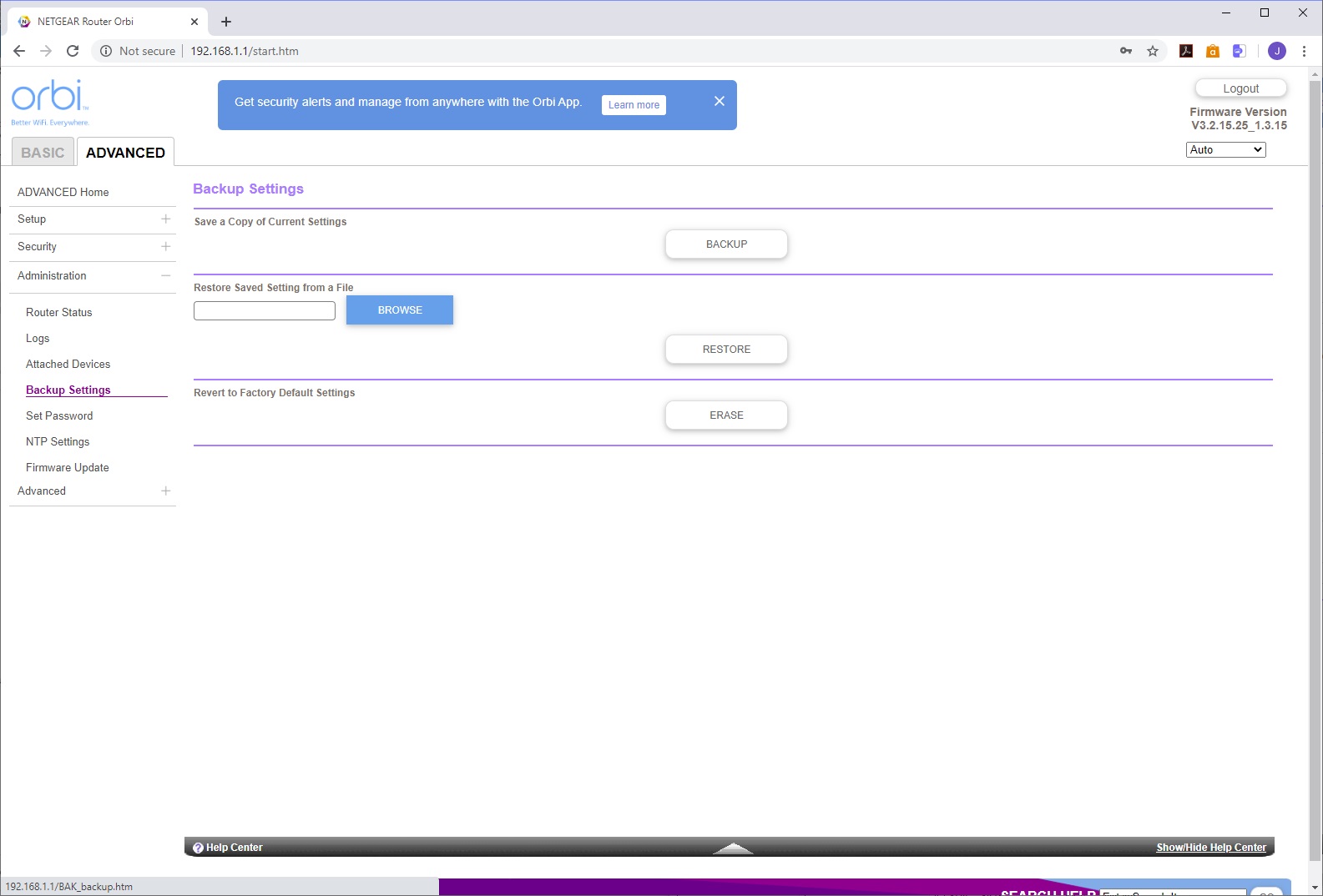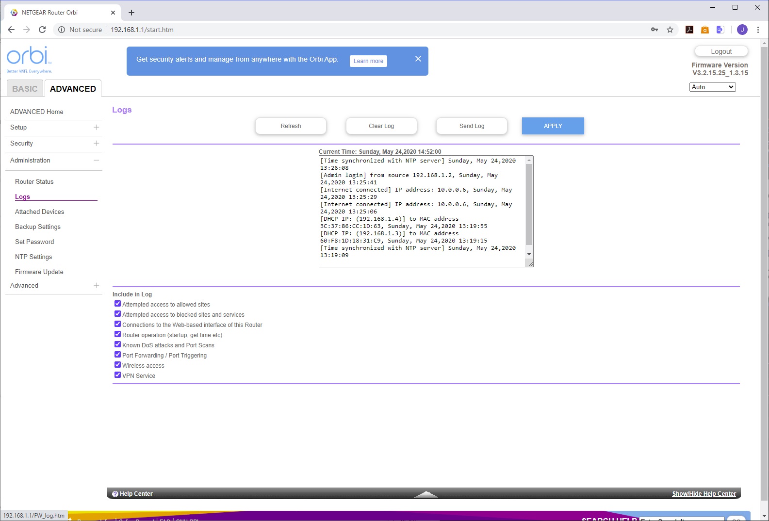 The Administration section provides further access to the Router Status overview. You can choose which events are logged and send the results to an email (although this requires email notification to be turned on). You can view the devices on the network in the same way as in the Basic area. The router settings can be backed up and restored. You can also change the password and security questions. There's an NTP section for configuring how the time is automatically set, and with the last menu item you can update the firmware on the router and attached satellite.