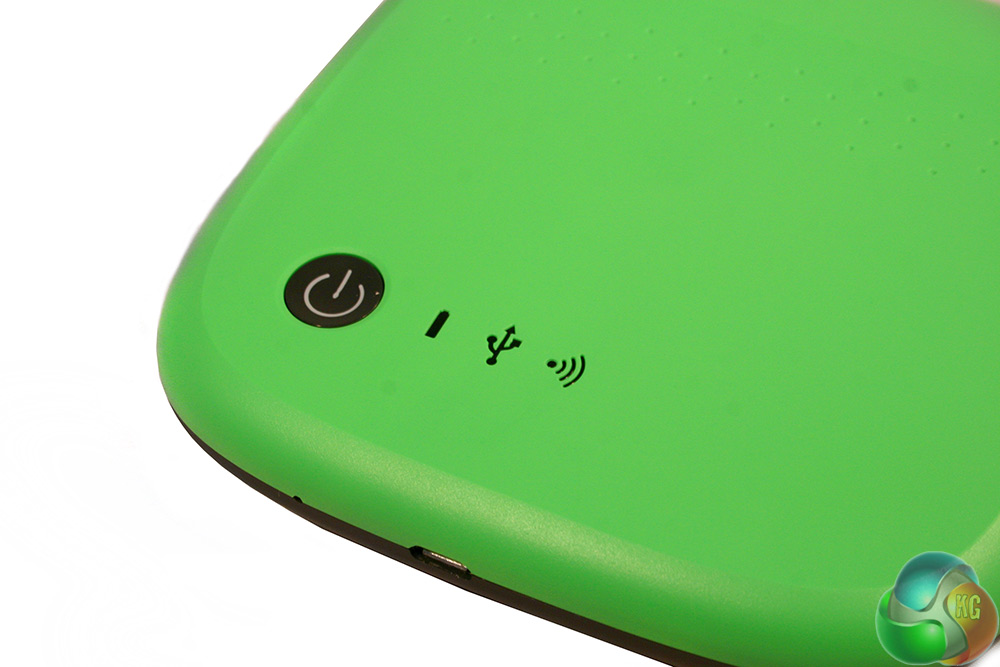 The drive Seagate sent us was the green version, which is actually a lot greener than the stock imagery suggests. The main casing is made from a hard plastic and is only broken up by the round, black power button on the bottom left and its nearby indicators, as well as a small ridge at the top.