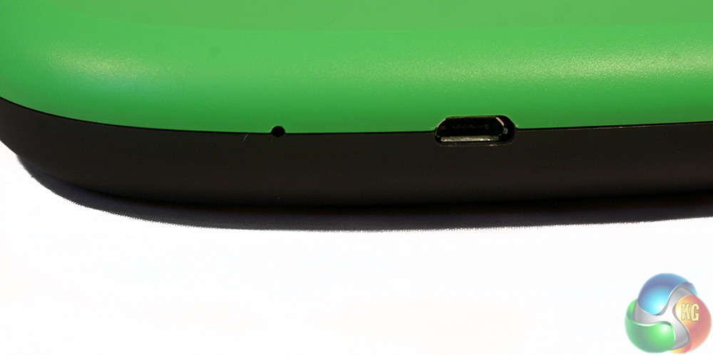 At the front, is the micro-USB connector for charging the internal battery and for sending over files from a non-WiFi equipped source, should you need to.