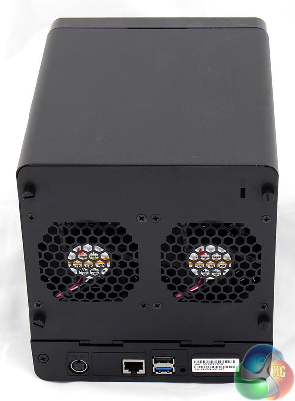 Most of the interesting stuff is on the back of the DS414j, although that may not be immediately apparent. The power jack is there and so are the two 80mm fans, along with the Gigabit Ethernet port.