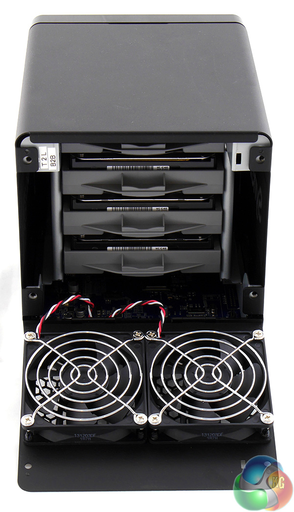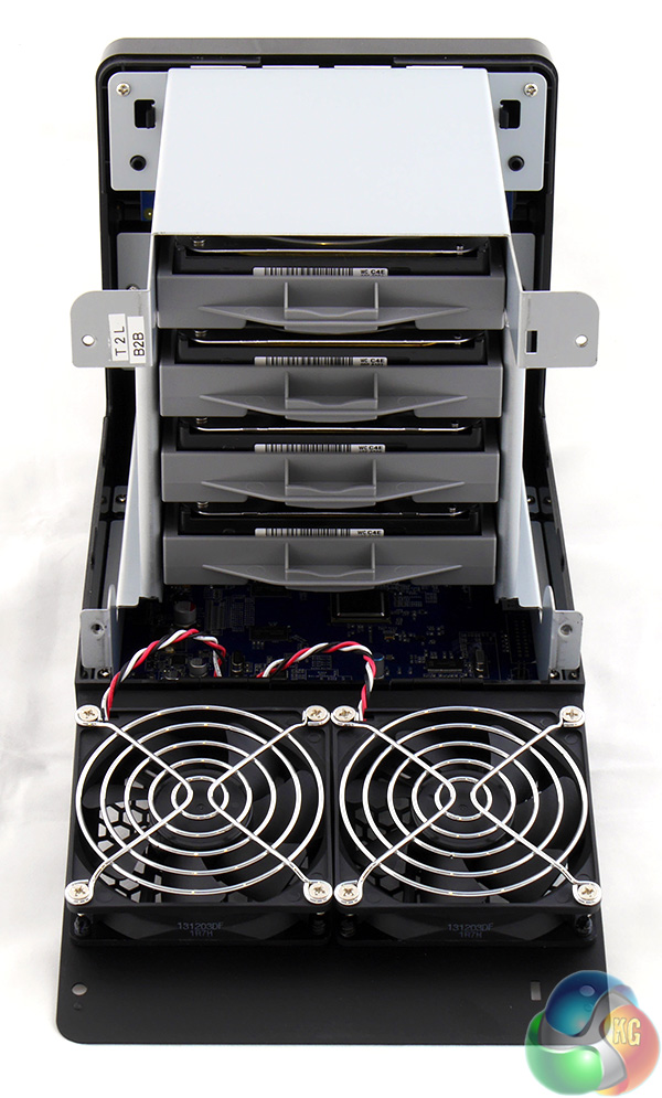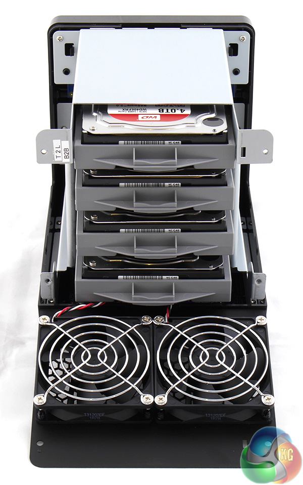 The other point to note about the rear of the DS414j are those four thumbscrews. Remove them and the back of the NAS drops down to reveal the four drive caddies.