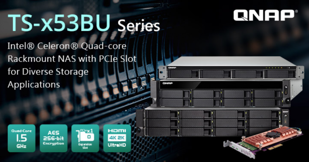 QNAP today is launching a new Rackmount TS-x53BU series NAS system. The TS-x53BU is available in 4-bay, 8-bay and 12-bay models with single and redundant power supply options for optimal performance and reliability. This system features four Gigabit LAN ports and slots for M.2 SSD and 10 GbE connections, so there is room for expandability.