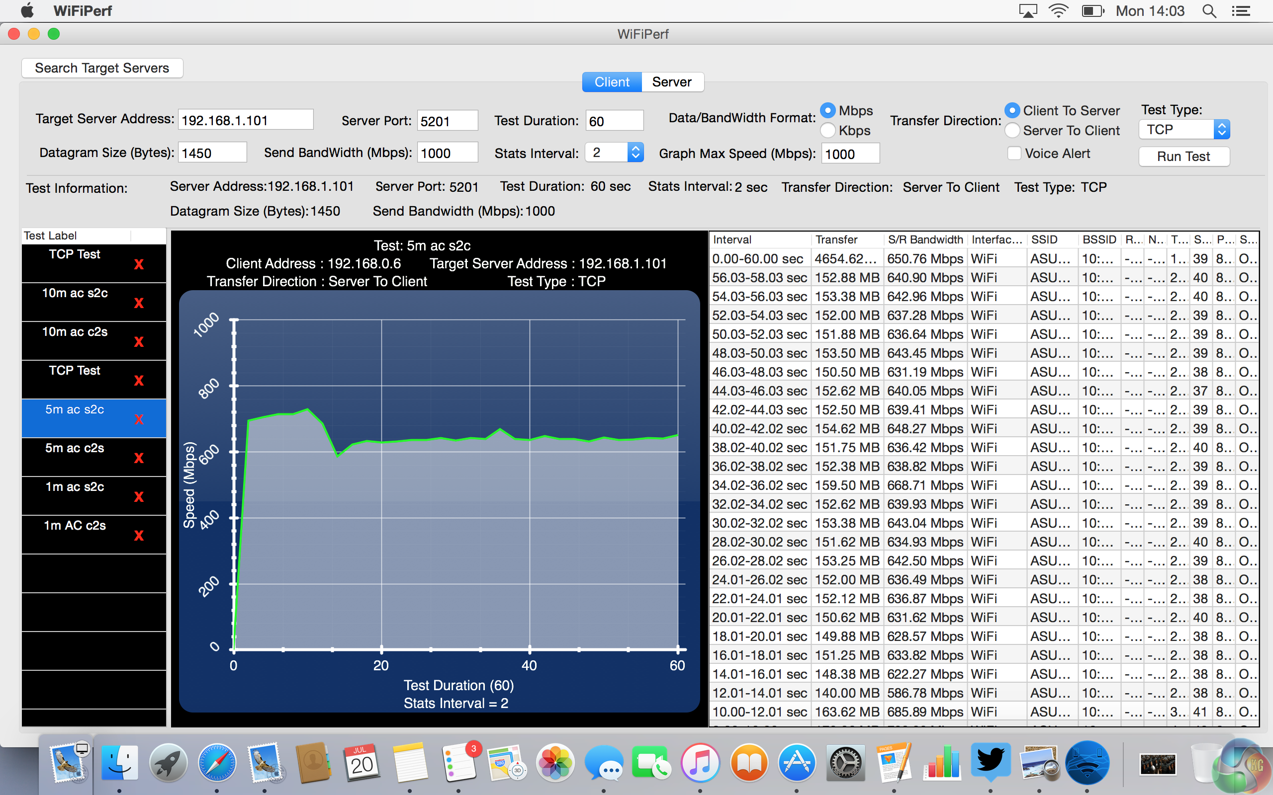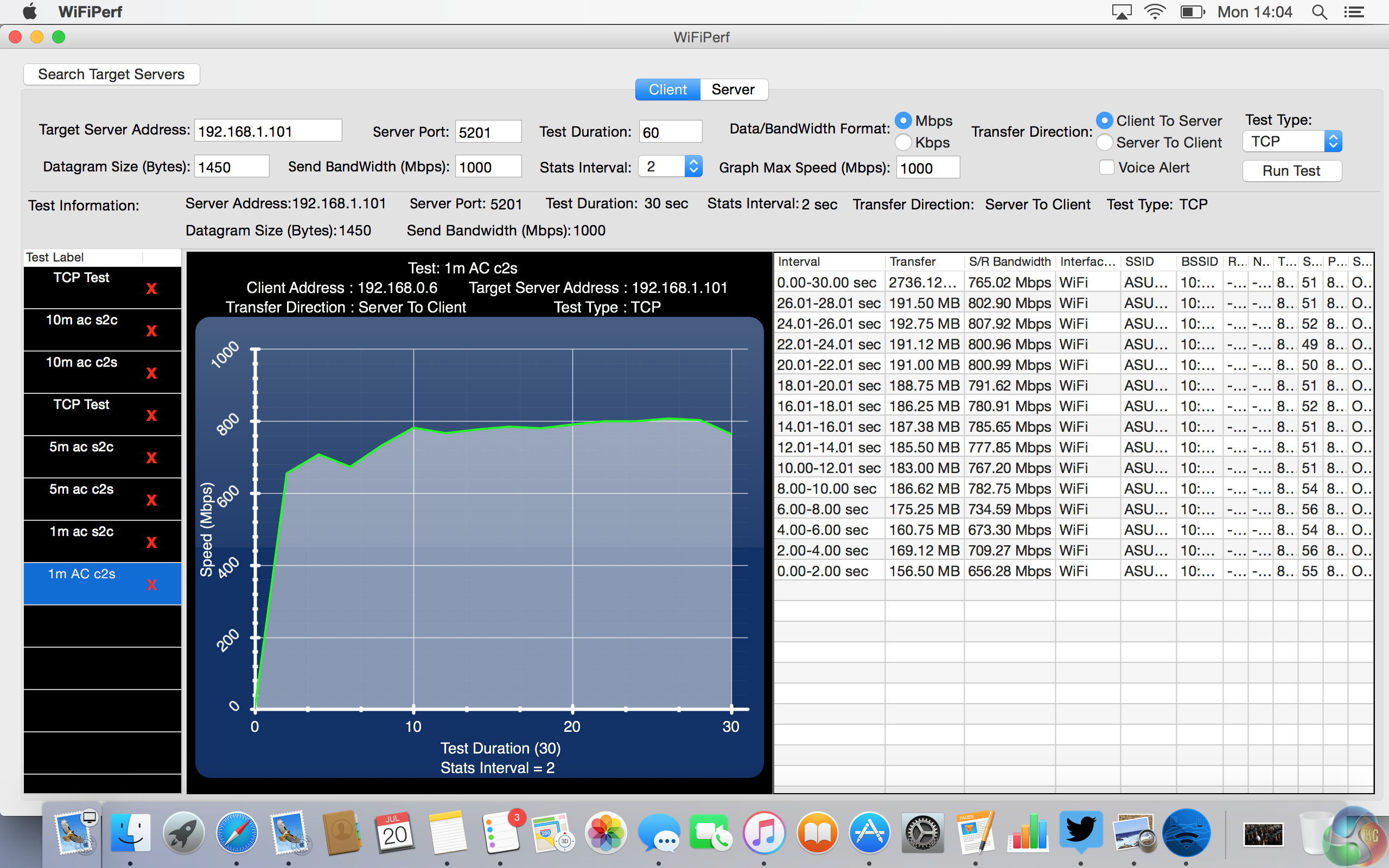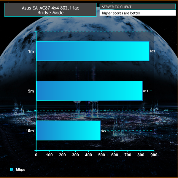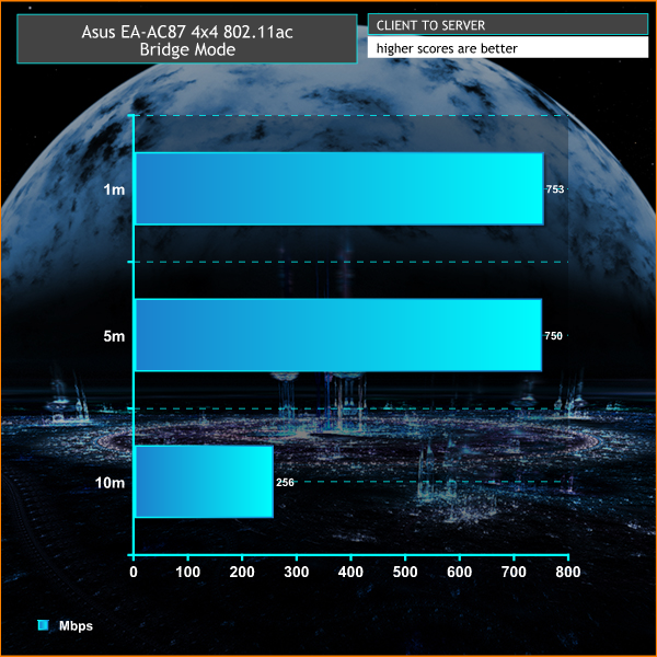 We tested the EA-AC87 in both access point and bridge modes, using the Mac software WiFi Perf. As a bridge, we used the Asus RT-AC87 with the aforementioned RT-AC87U in 4×4 wireless mode, to see the absolute best speeds we could squeeze from it. The test was run for 60-120 seconds, in both client-to-server and server-to-client modes.