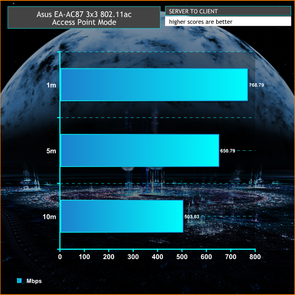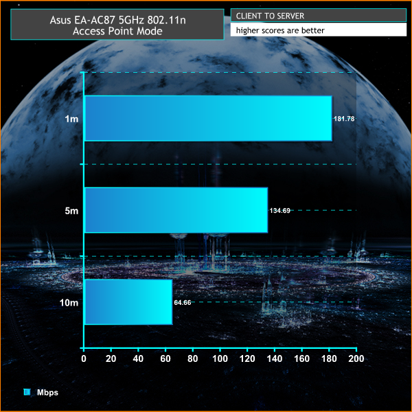 In access point mode, we tested it just like a router, with a cable stretching from one Mac to our central location, then used a 2013 MacBook Pro to measure the speeds at 1m, 5m and 10m with direct line of sight, on both 5GHz 802.11n and 5GHz 802.11ac. The MacBook Pro only has a 3×3 antenna, and doesn’t support 600Mbps 802.11n, so it’s still not fully capable of pushing the EA-AC87 to its limits.