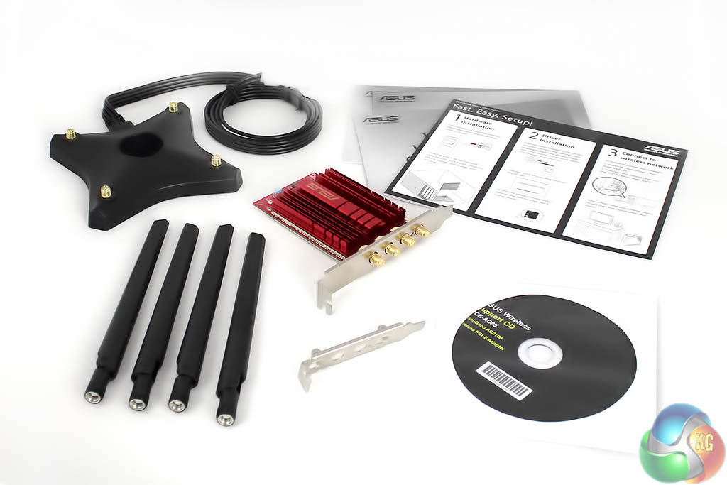 With a simple red half-length PCI card, four antennas and a replacement IO plate for use in the smallest mini ITX cases, there’s not a great deal to talk about with the physical design of the Asus PCE-AC88.