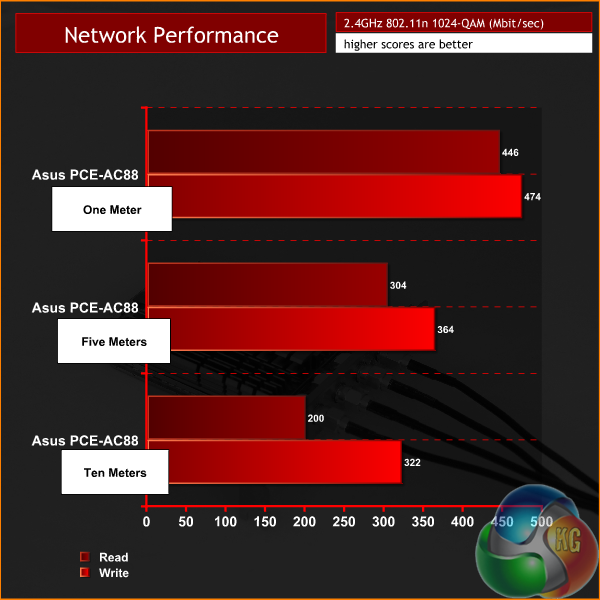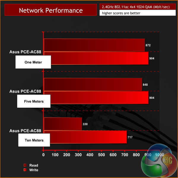 We averaged out results from both reading and writing a 13.7GB movie from one PC equipped with the Asus PCE-AC88 to another connected via Ethernet to a high-end Asus RT-AC88U router, which supports similar 1024-QAM 4×4 802.11ac wireless speeds.