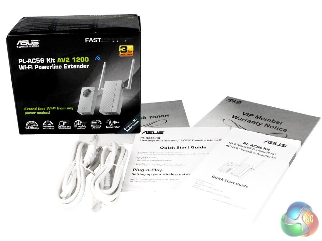 The packaging contains two adapters, with a pair of ethernet cables to connect each of them to your router and a single client PC. And of course the usual quick-start guide and VIP stuff you get with every Asus product.