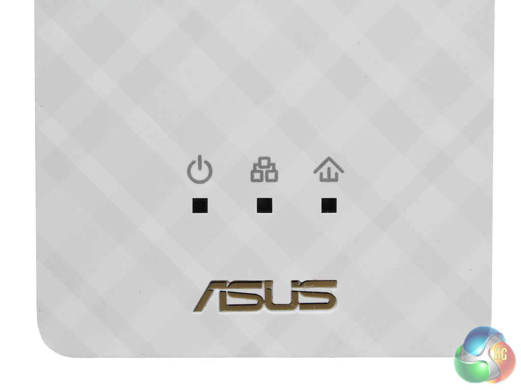 There are three LEDs at the bottom indicating power, power line connectivity and network connectivity
