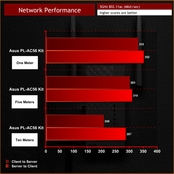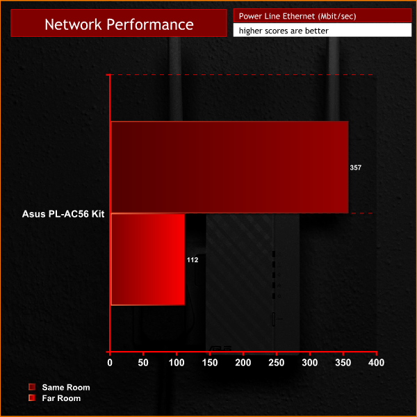 The best way to assess these results is to compare with the performance of its smaller sibling, the Asus PL-N12 kit. The advantage of AV2 is clear to see. Previously the same-room result was under 100Mbit/sec, here it's 357 Mbit/sec.