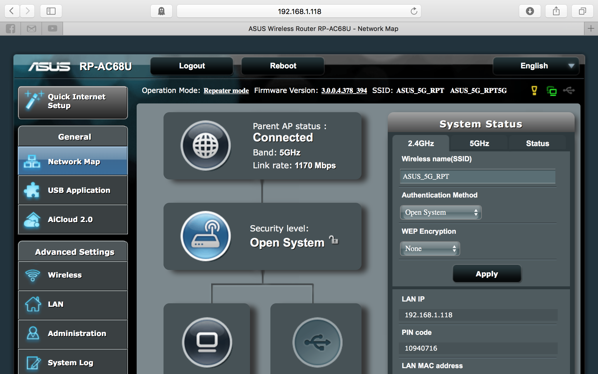 The Asus RP-AC68U creates up to four wireless networks, depending on the mode it is in. It can extend up to two networks from a router, appending text to the original network name, with _RPT for 2.4GHz networks, and _RPT5G for 5Ghz networks.