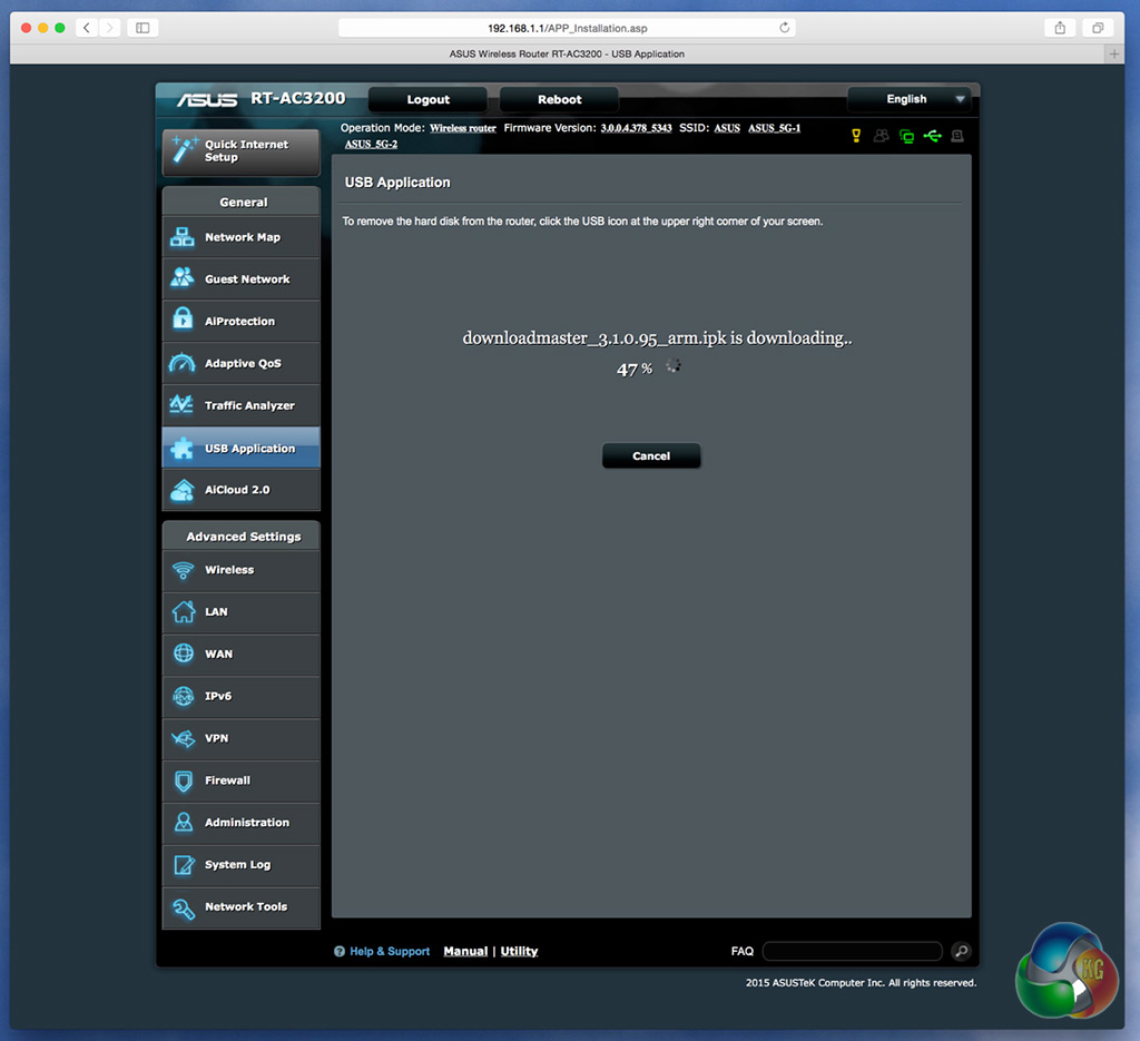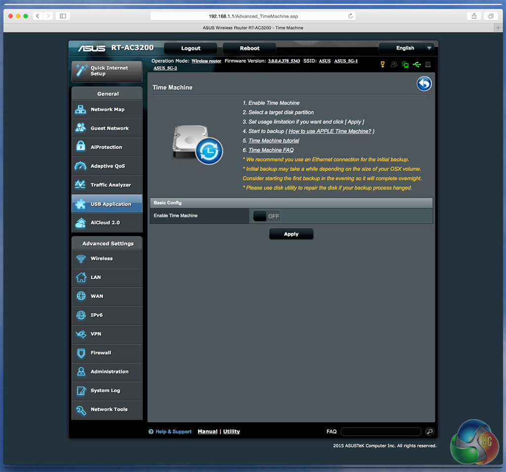 The ‘USB Application’ screen gives you a submenu of six settings for connected USB devices: AiDisk, Media Services, Network Printers, 3G/4G modems, Time Machine (for Macs) and Download Master, the on-board Torrent software, used if external storage is connected.