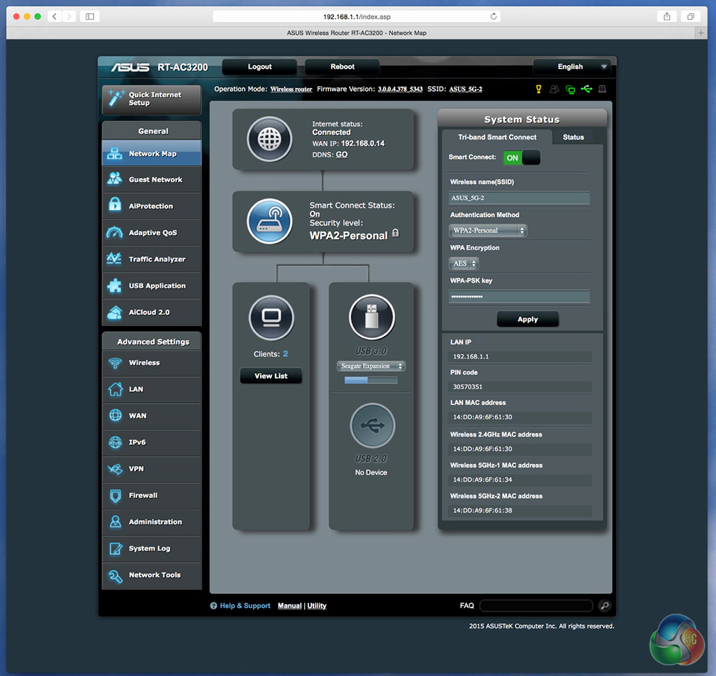 The SSIDs are listed at the top, and underneath it you’ll see the WAN IP, a client list, and a quick view of any connected USB devices. On the right is all the necessary info for the wireless networks. Click the ‘Status’ tab for graphs showing real-time CPU and memory usage.