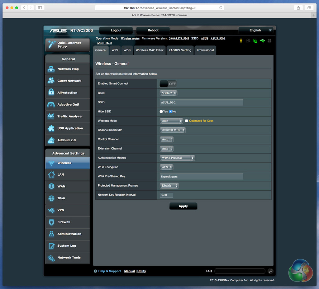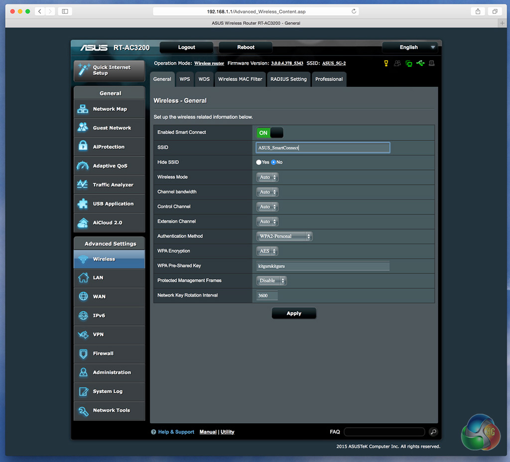 Firstly we should look at the headline feature of the AC3200, Smart Connect. With the setting disabled, the router outputs three separate wireless SSIDs, and each client can connect to one of the three.