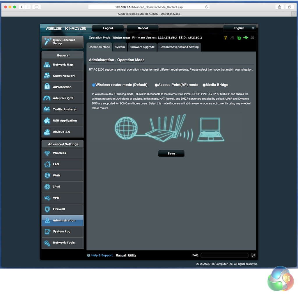 The ‘Administration’ page lets you back up settings, switch between router, access point and bridge modes and upgrade the firmware.