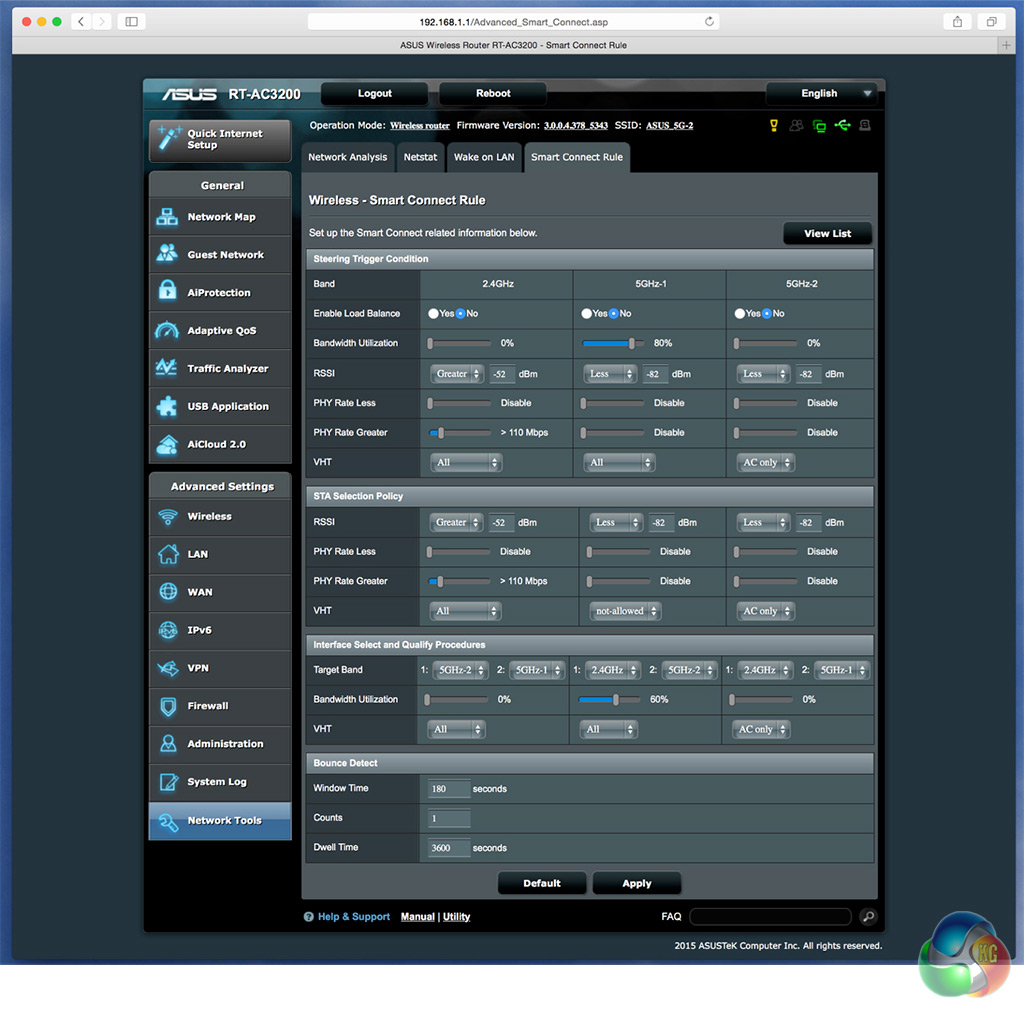 At the very bottom is the ‘Network Tools’ menu. The fourth tab along brings up a load of settings to customise exactly how Smart Connect allocates wireless networks to clients. You can choose the minimum signal strength required for the switch, and so on. It’s not very well laid out, with little in the way of text to to explain it, and is one of the rare examples of the software that needs a bit more attention from Asus. Unsurprisingly, we didn’t change any of these settings when testing.