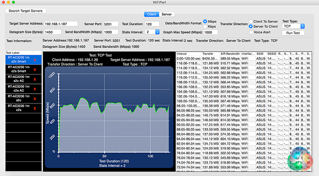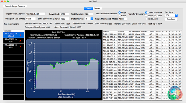 For testing I used a pair of Macs and the excellent OS X software WiFiPerf. I had an iMac connected to the RT-AC3200 via ethernet, with a 3×3 2013 MacBook Pro connected wirelessly.