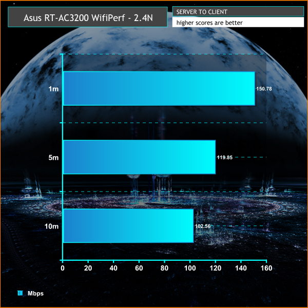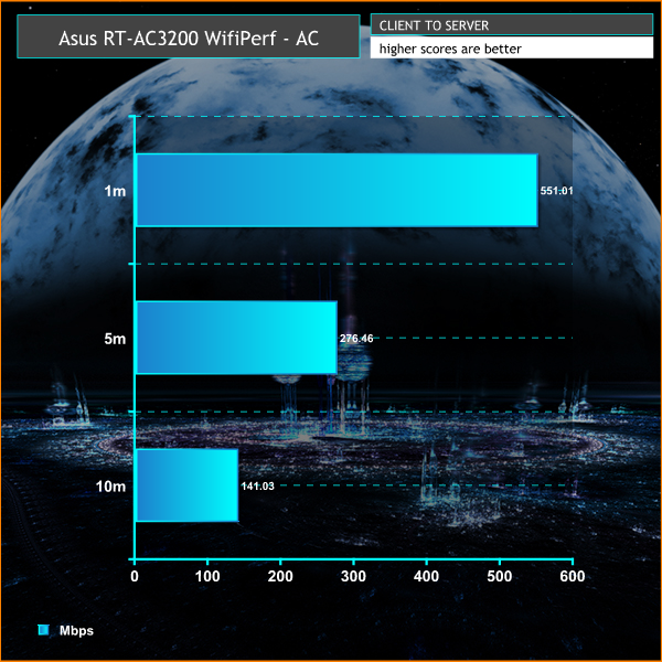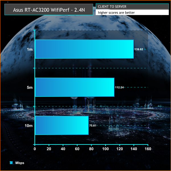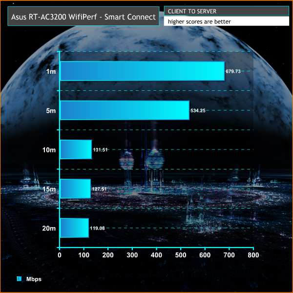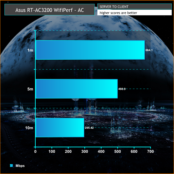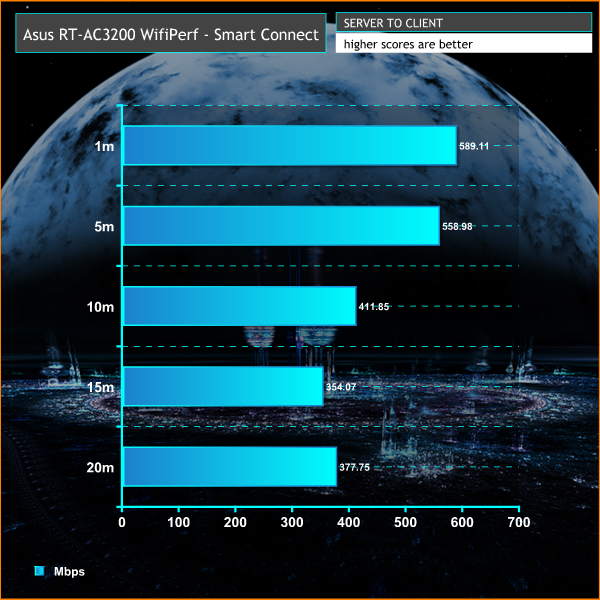 It’s worth mentioning many routers can’t handle data transfer whatsoever at 20m range, so it’s an excellent achievement to see the RT-AC3200 achieve 350Mbps in s2c mode.