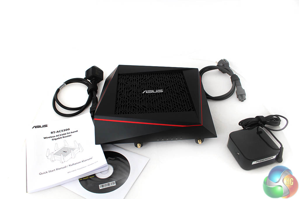 The Asus RT-AC5300 has an external power supply with a standard ‘cloverleaf’ power connector. As you can see in the image, the router is really quite large. You also get a software CD with the manual, and our sample had both EU and UK power leads.