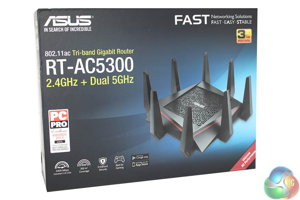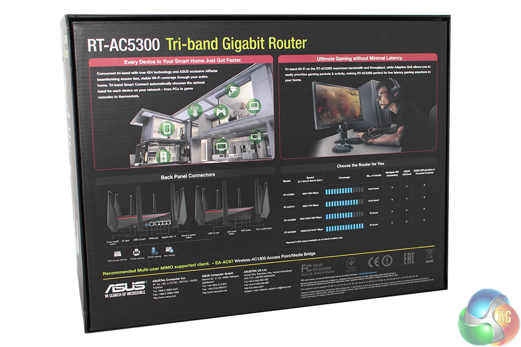 The Asus RT-AC5300 packaging is pretty much as you would expect. It adopts a similar appearance to most Asus networking kit with a blue and black design. The box isn’t particularly large, and all the main features are listed.