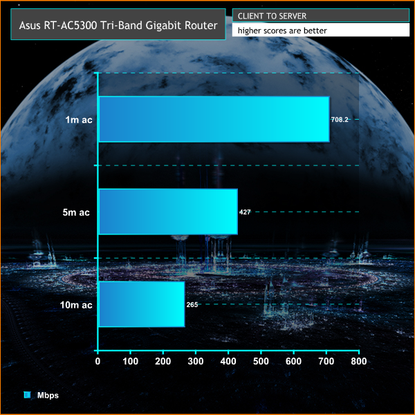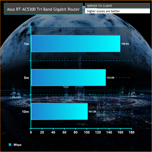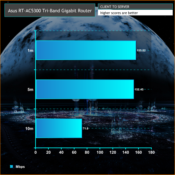 Our overall evaluation of the Asus RT-AC5300 doesn’t really depend on 2.4 GHz 802.11n performance, but from our results you can see it does very well in this area, with some results that blow many other routers out of the water. At some points (visible in our screenshots) it goes above 165 Mb/sec, which is very impressive for this slower wireless protocol.