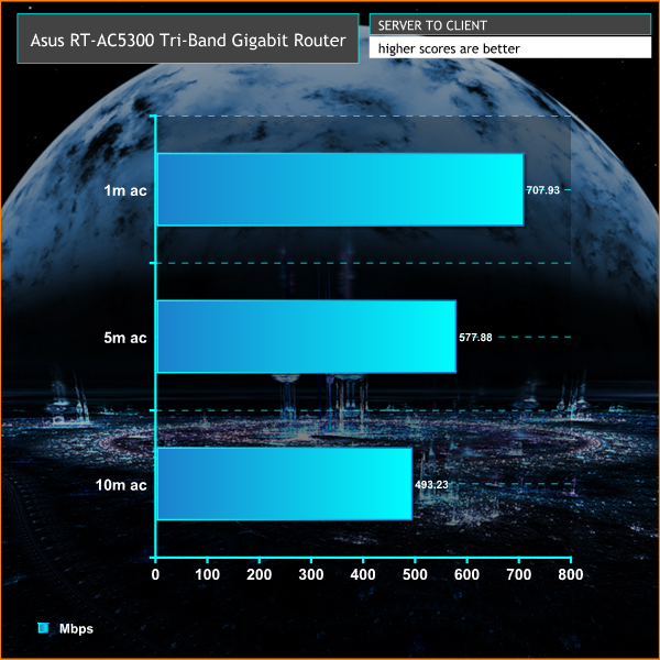 Likewise, with 3×3 802.11ac, the Asus RT-AC5300 offers transfer speeds that are notably superior to many alternative routers. As a very general rule, we expect to see about 600 Mb/sec from a 3×3 802.11ac router. Anything above that is very good performance. At short range, the Asus RT-AC5300 managed over 700 Mb/sec, a superb result, which isn’t the very fastest speed we’ve seen (we measured 765 Mb/sec from the Asus RT-AC87) but it still leaves many competitors in the dust.