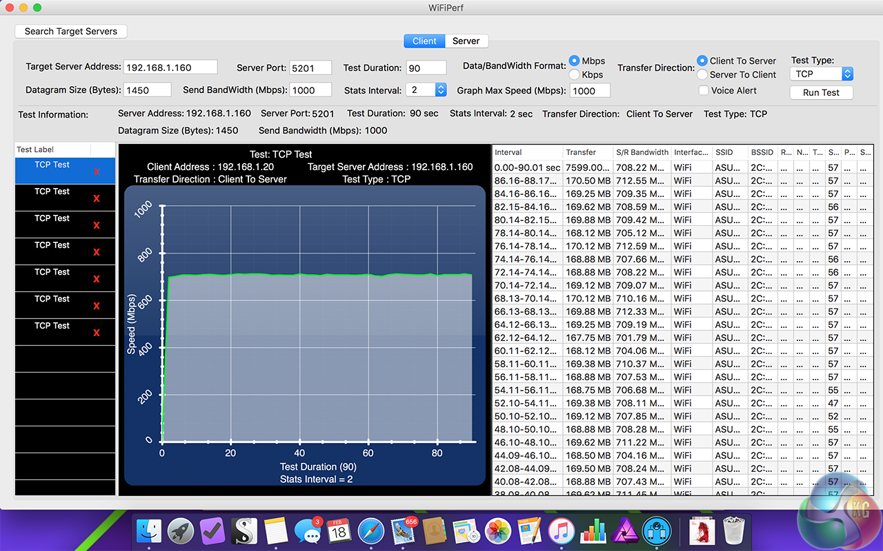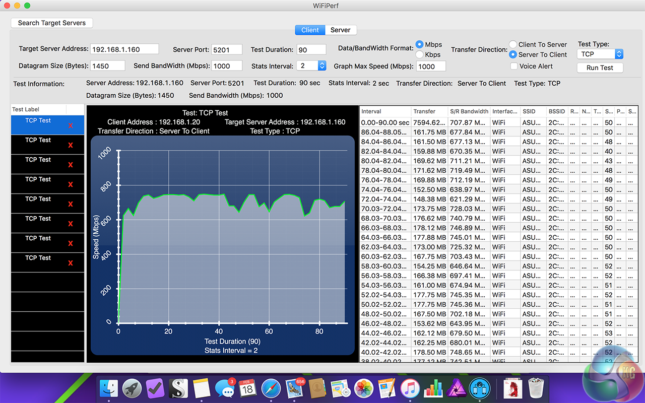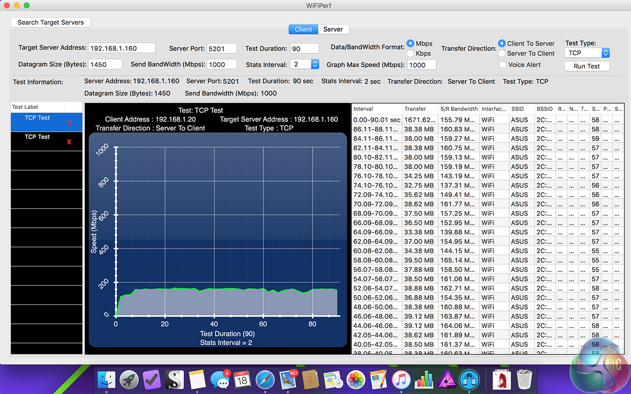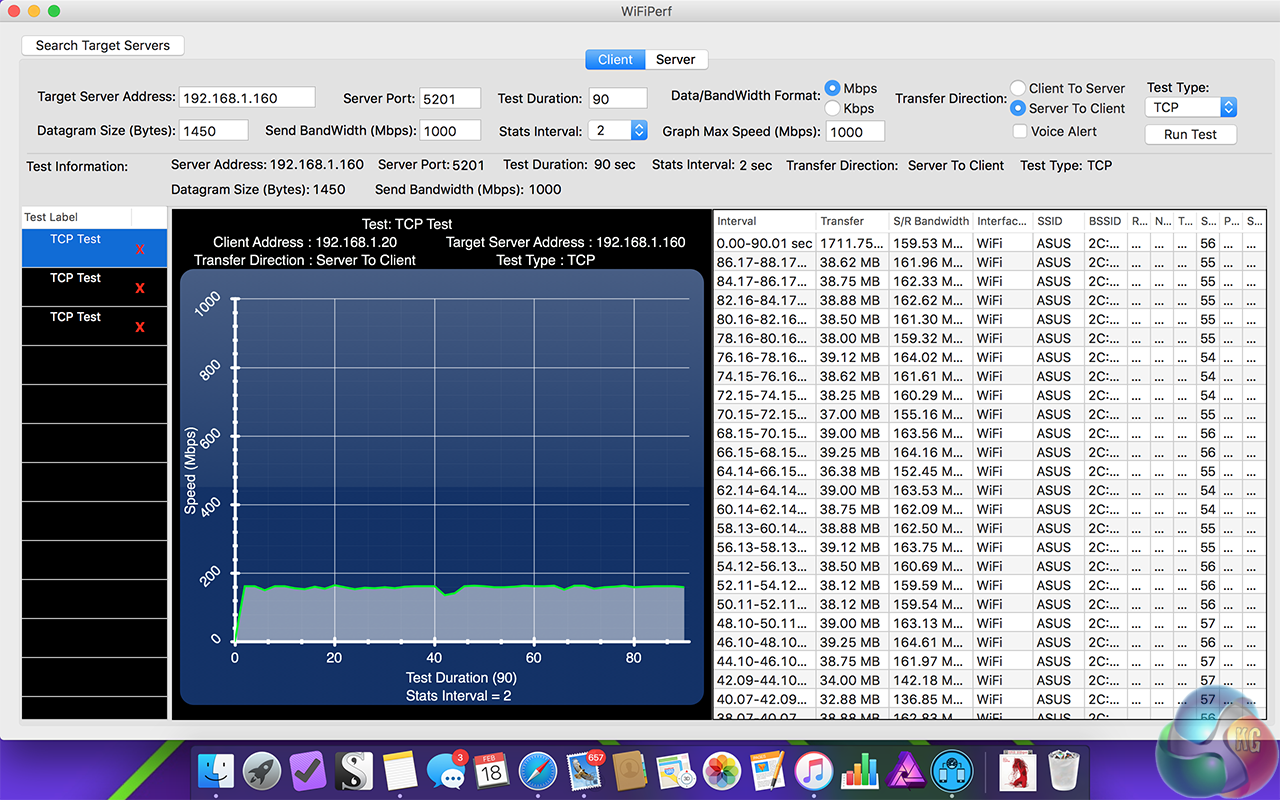With one Mac connected to the Asus RT-AC5300 via an ethernet cable as a ‘server’, we measured wireless performance with direct line of sight to the router at one, five and ten metres. We used the Mac testing software WiFiPerf, which is based on the open-source iPerf software (also available for Windows and Linux). It measures both client-to-server (c2s) and server-to-client (s2c) speeds, which can vary considerably.