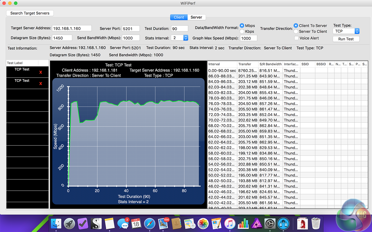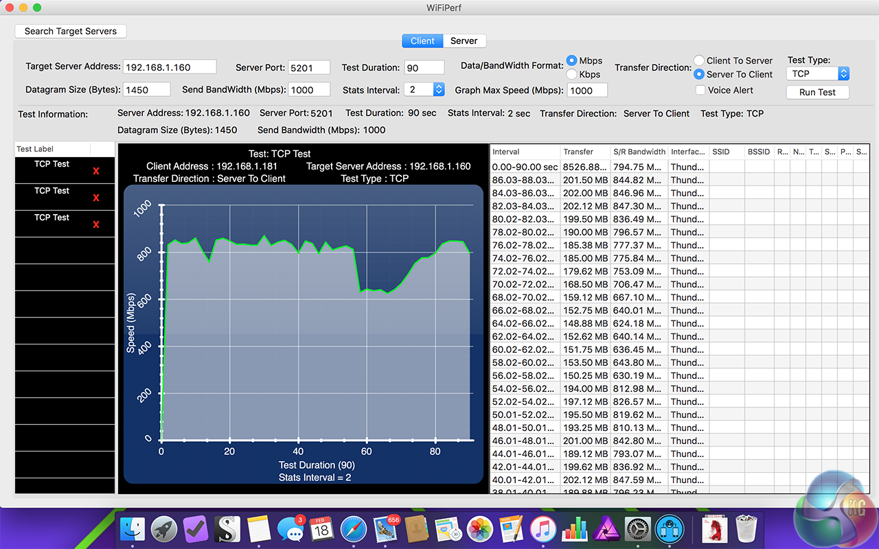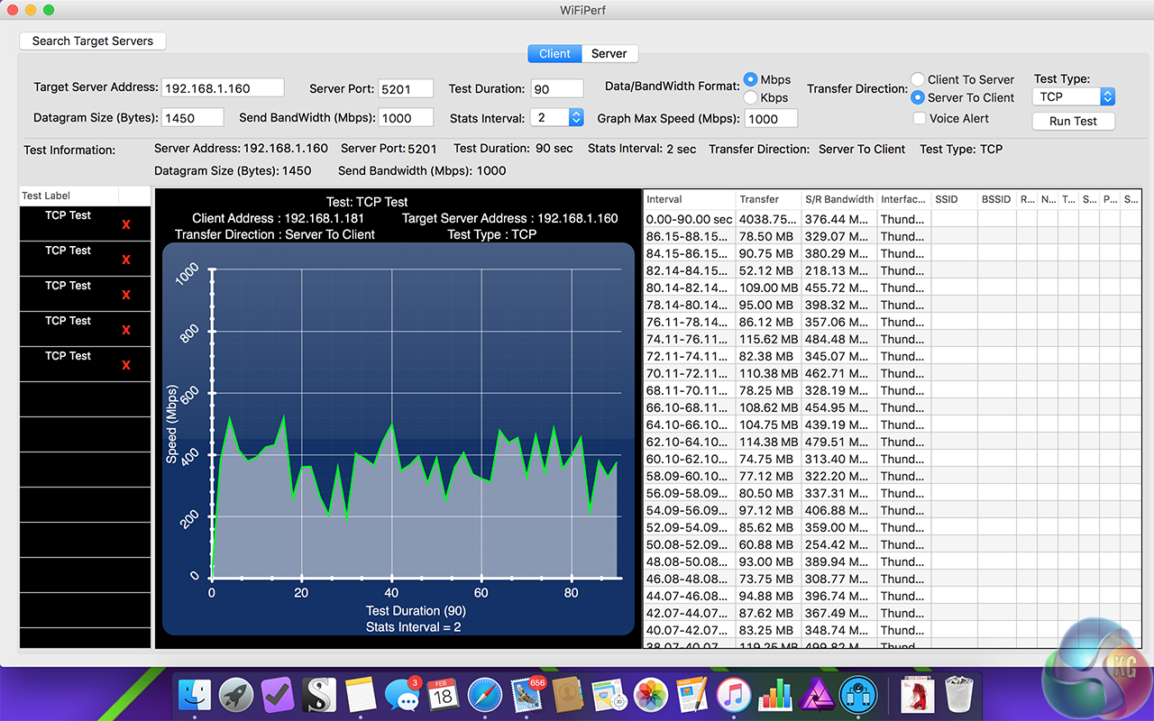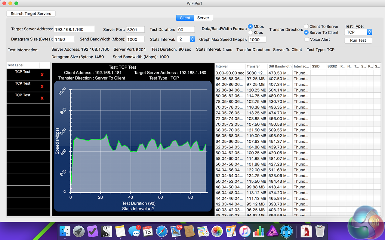 With two 4×4 routers as clients, we ran one final test, measuring data speeds between the two clients directly, with the Asus RT-AC5300 in the centre. We placed each at opposite ends 5 metres away from the Asus RT-AC5300, each connected via ethernet to a Mac, so the only wireless links were the two between the router and the clients.
