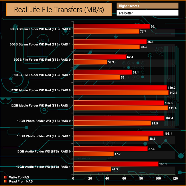 The AS3102T handles writing the larger files of the Movie, Photo and Audio test folders better than the small bity files of the Steam and File folder tests. When it comes to reading back the files from the 50GB file folder and the 10GB Audio folder in both RAID 1 and RAID 0 the performance does seem to slump.