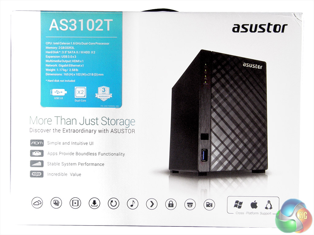 Besides an image of the NAS unit, the front of the box has a panel containing the hardware specifications and a line of icons displaying what the AS3102T can be used for.
