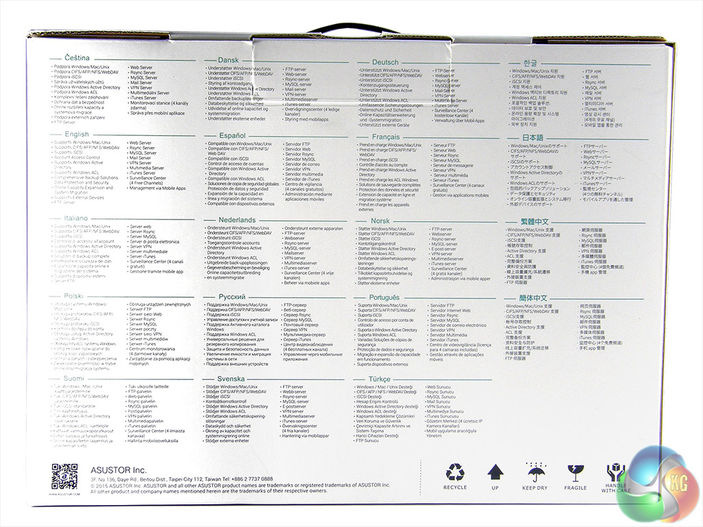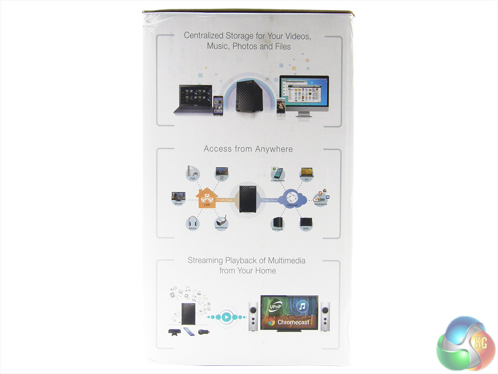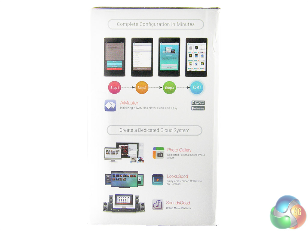 One side of the box has a walkthrough of how to use the Asustor AiMaster app to configure the AS3102T using a tablet or smartphone. There's also descriptions of Photo Gallery, LooksGood (video) and SoundsGood (audio) apps. The other side of the box shows some ideas of what the AS3102T can be used for besides just dumping files on.