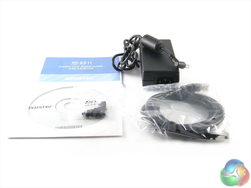 The box bundle that comes with the AS3102T contains everything you need to get the unit up and running; 60W Delta Electronics power supply, Ethernet cable, enough thumbscrews to mount two drives, a quick start-up guide, and an installation CD.