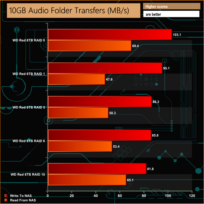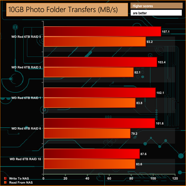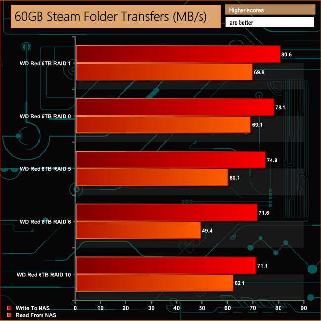 When it comes to real life file transfers, once again RAID 6 reads are the AS3104T's Achilles heel. It doesn't seem to matter what type of file it's dealing with as it's the worst performer when dealing with the small files of the 60GB Steam and 50GB file folder tests, as well as the larger files of the 12GB Movie folder test.