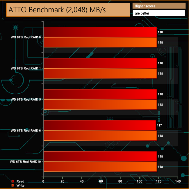 Asustor quote performance figures for the AS3104T as 112MB/s for both reads and writes in RAID 5, speeds that were just bettered across all the arrays under test conditions.