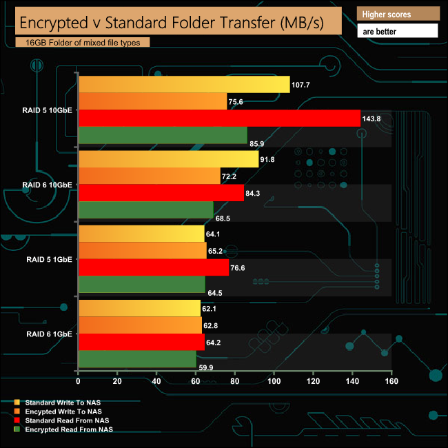 The integrated hardware encryption engine in the AS4004T seems to be more efficient dealing with encrypted data at a slower connection speed than at higher speeds.
