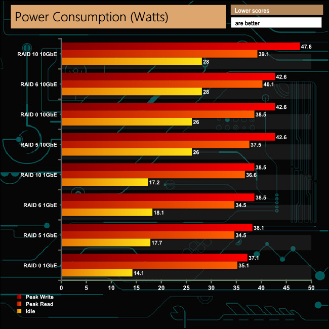 We tested the peak power consumption of a NAS at the wall during a run of CrystalDiskMark 5.0.2 as this version of the benchmark runs the read and write benchmark suites separately so it is easier to monitor what power the device is using during each function.