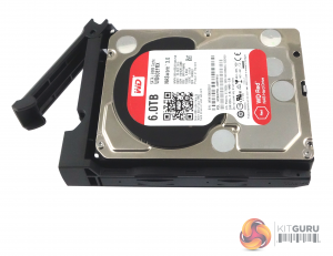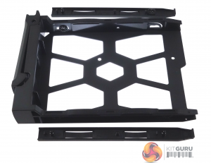 The AS4004T uses a tool free system to hold the hard drives in place. Two plastic strips with built-in pins fit into the sides of the drive tray with the pins pushing through a vibration deadening grommet into the hard drive sides. It's simple but very effective.