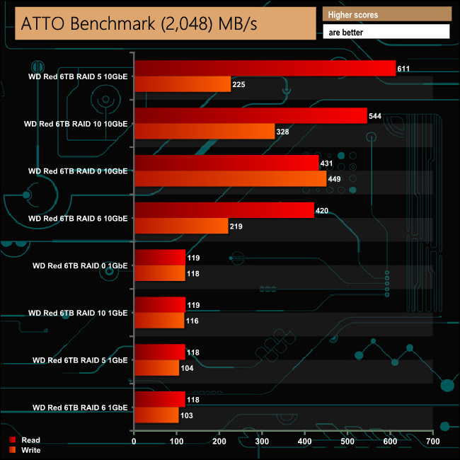 With a 1GbE connection the NAS performed as you might expect although once again there was a drop in the write speeds of RAIDs 5 and 6.