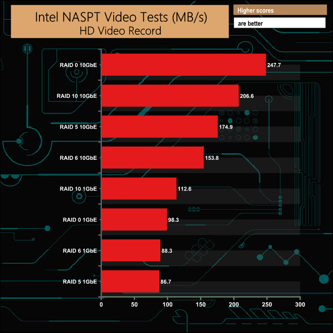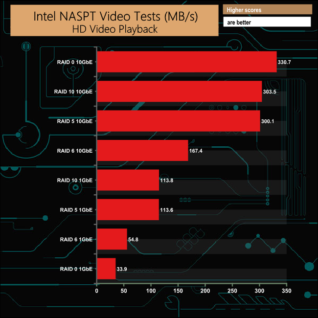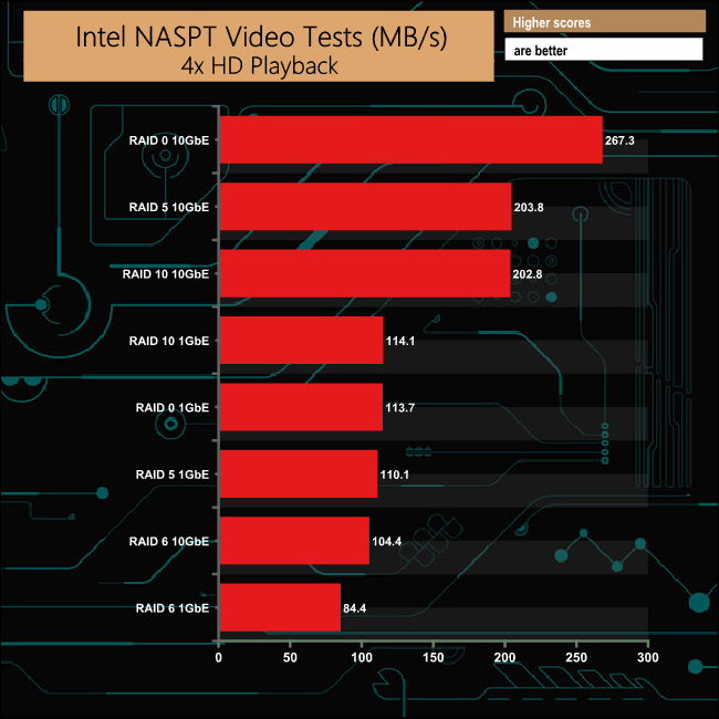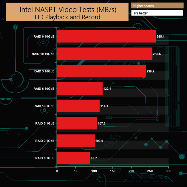 The AS4004T performs reasonably well in the video traces of Intel's test. The best performance came in the HD Video Playback test using a 10GB/s connection with 300MB/s and over speeds in RAID's 0,5 and 10. Once again the RAID 6 performance lagged behind.