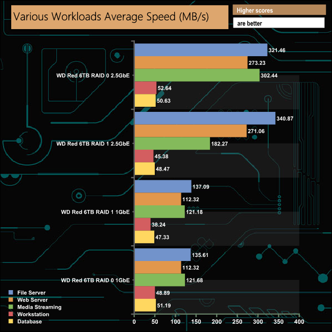 The Asustor AS5202T displays strong performance in our workload scenarios, even when it's using the 1GbE connection. The best figure we saw from the tests was the 340.87MB/s for the File Server test with the disks built into a RAID 1 array, using a 2.5GbE connection.