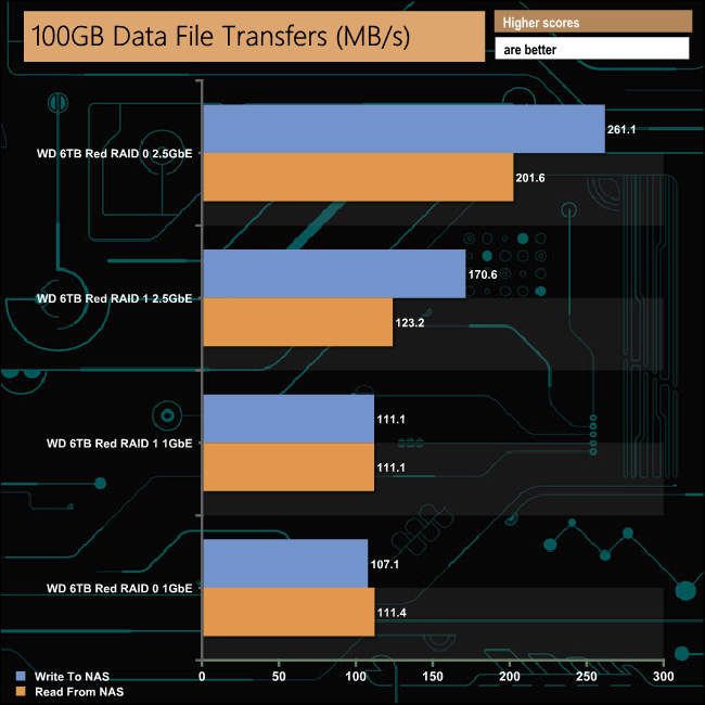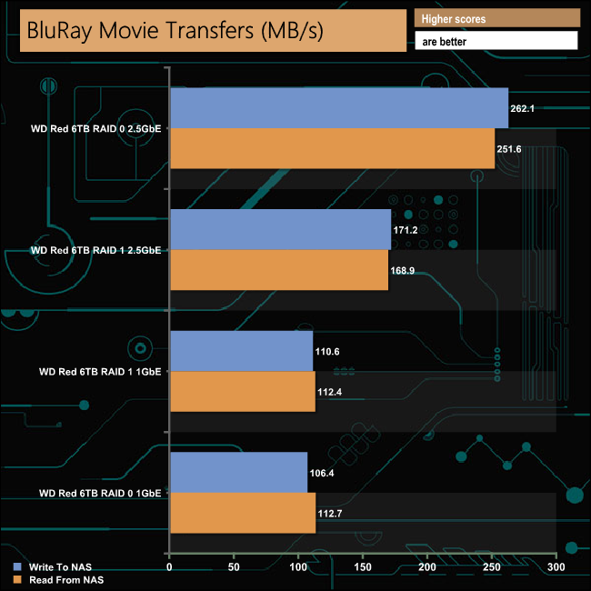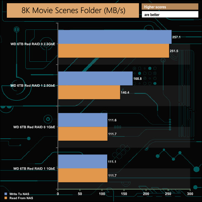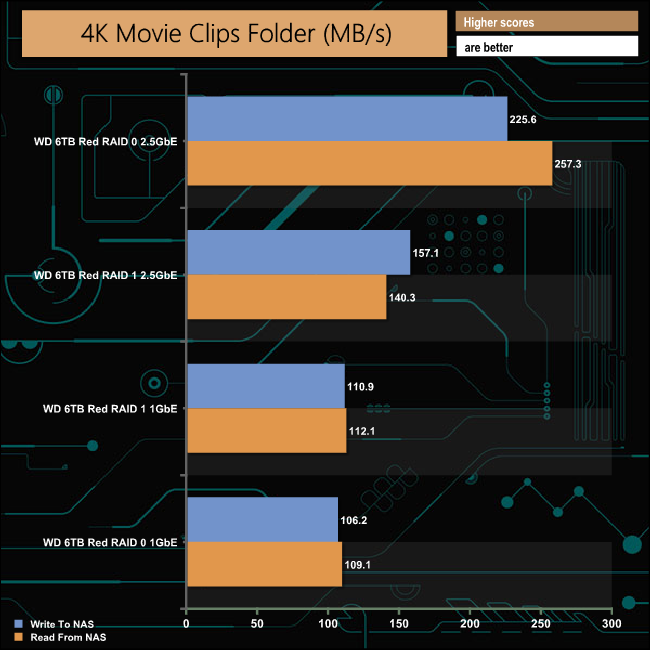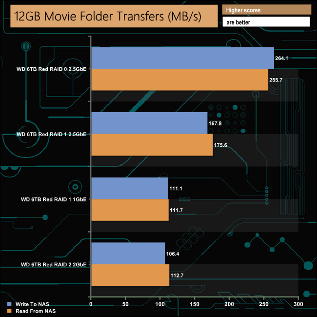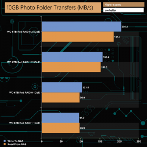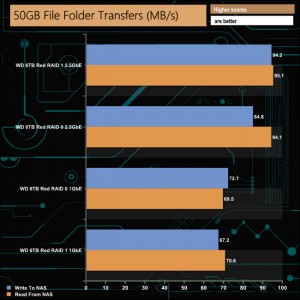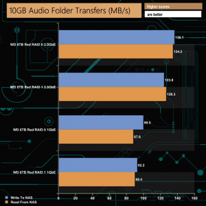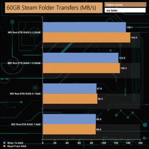 The AS5202T dealt with our real life file transfer tests with ease. With a 2.5GbE connection we got over well over 200MB/s transfer rates for most of the tests, with the exception of the ones dealing with folders containing a lot of small-sized files. The 60GB Steam and 10GB Audio folders produced over 100MB/s for read and writes which is much faster than the transfer rates for the same tests with a 1GbE connection. For the 50GB file transfer tests there wasn't that much of a difference between the two connection speeds in either RAID array.