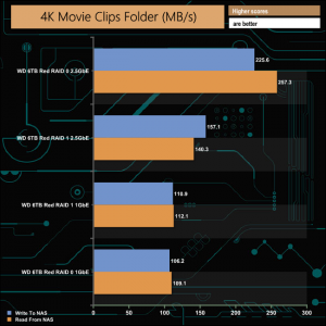 To test real life file/folder performance we use a number of different file/folder combinations to test the read and write performance of the NAS device. Using the FastCopy utility to get a MB/s and time taken for each transfer, the data is written from and read back to a 240GB SSD.