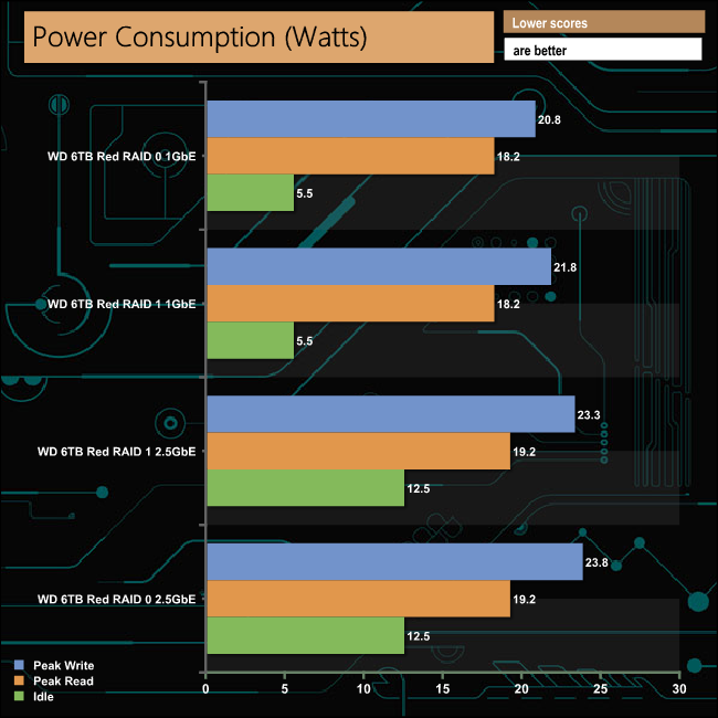 We tested the peak power consumption of a NAS at the wall during a run of CrystalDiskMark 5.0.2 as this version of the benchmark runs the read and write benchmark suites separately so it's easier to monitor what power the device is using during each function.